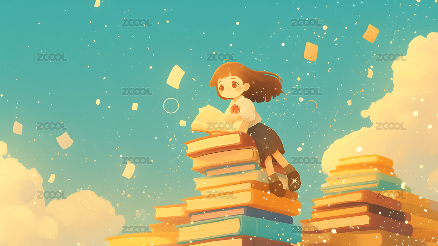 蓝天背景天空的云朵上坐着读书的孩子