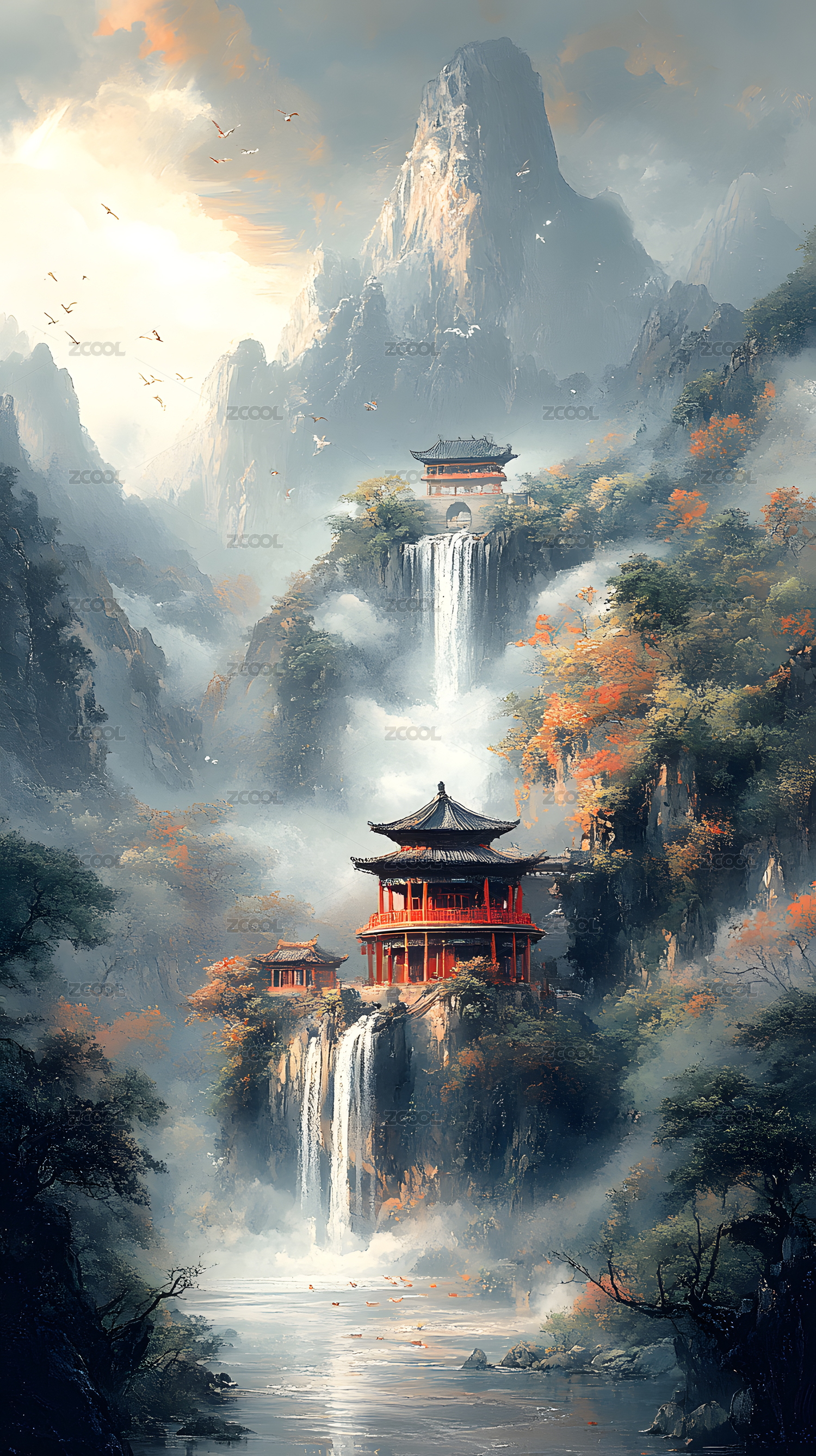 山间寺庙瀑布仙境