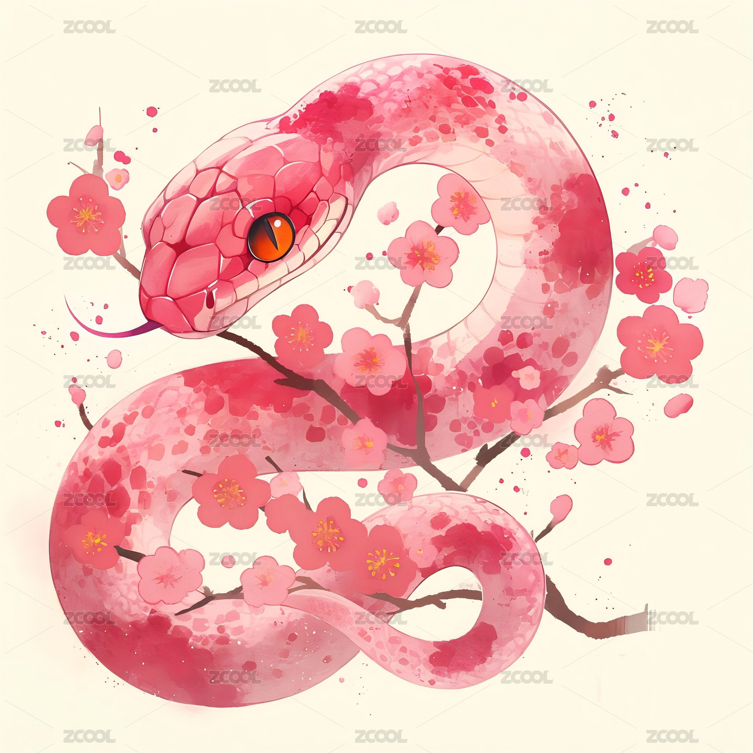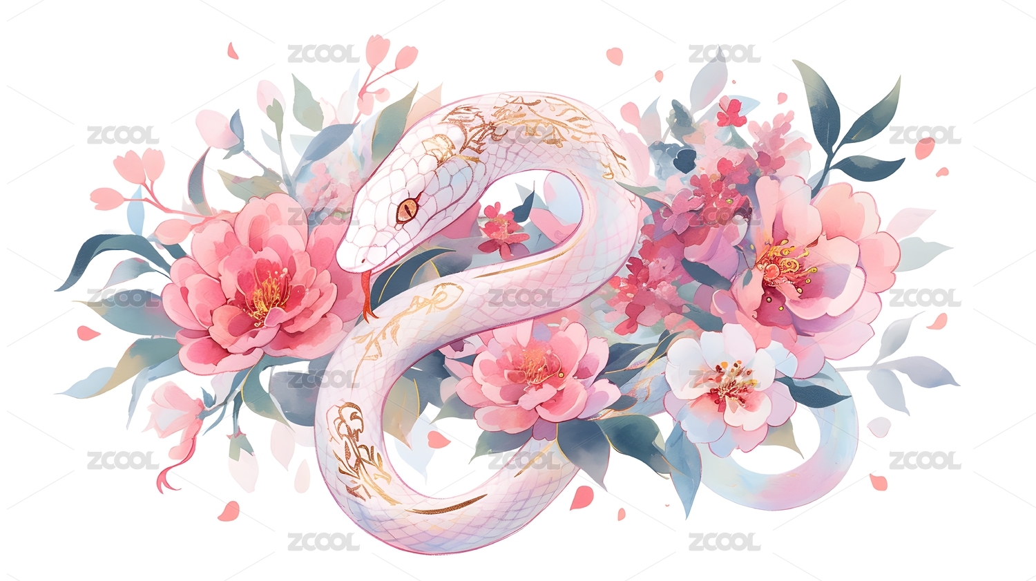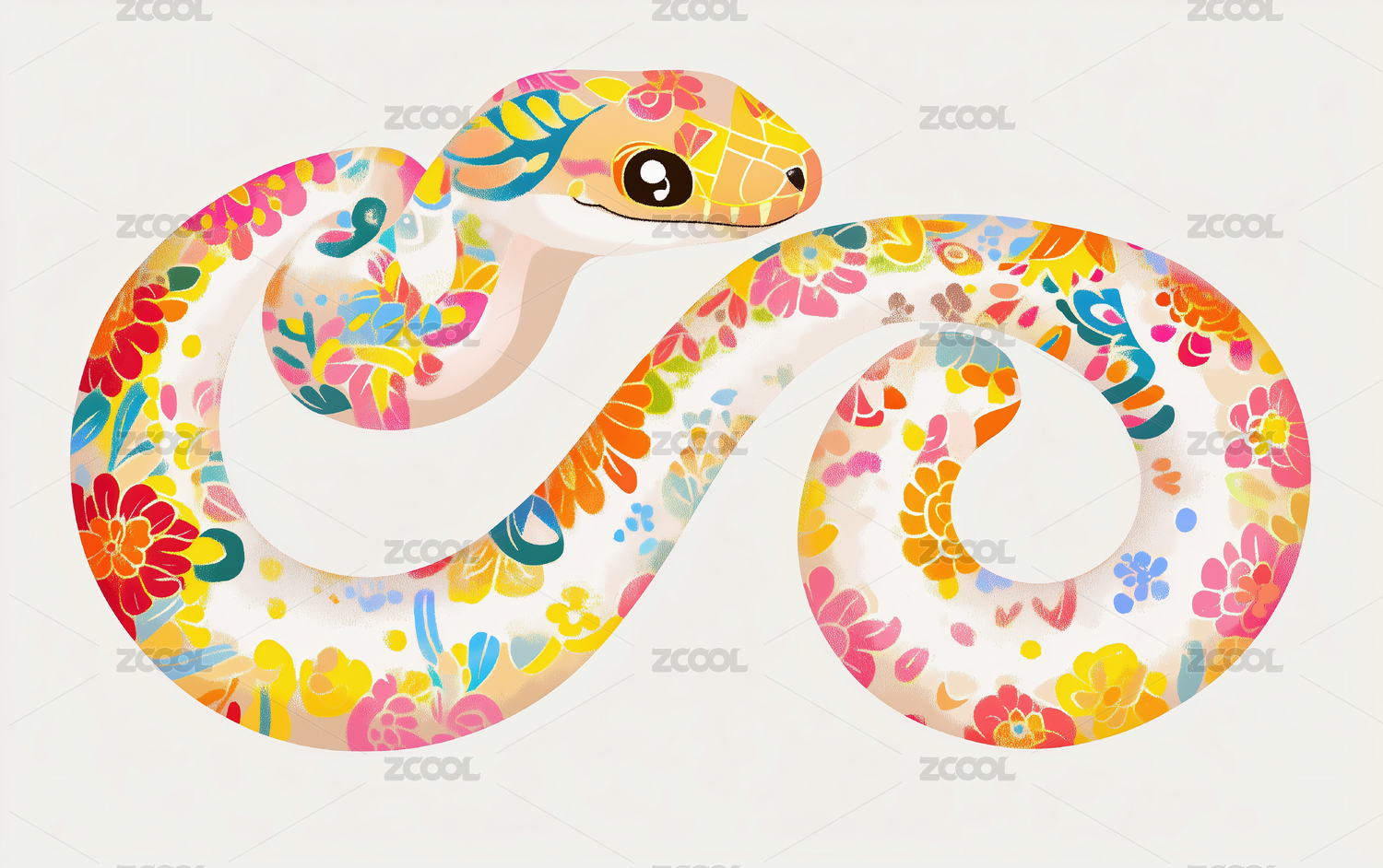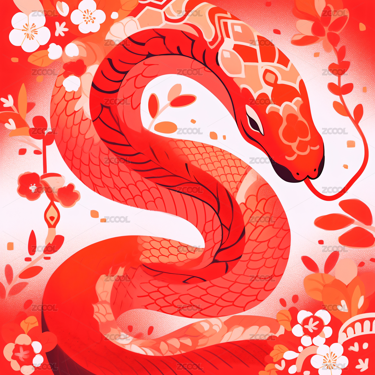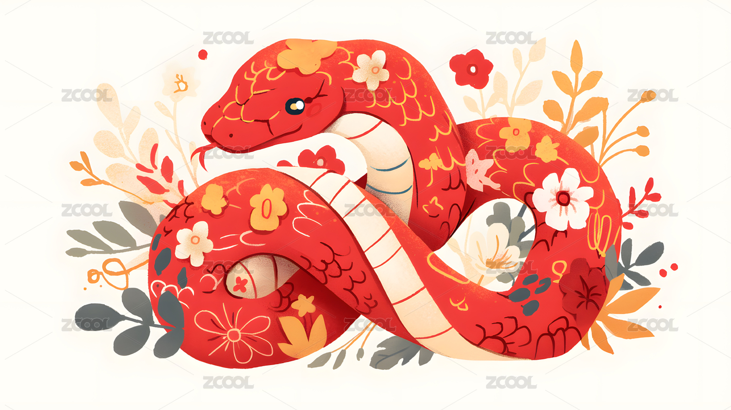中国风,国潮风,蛇,蛇年,生肖蛇,剪纸,卡通,插画,花,花蛇