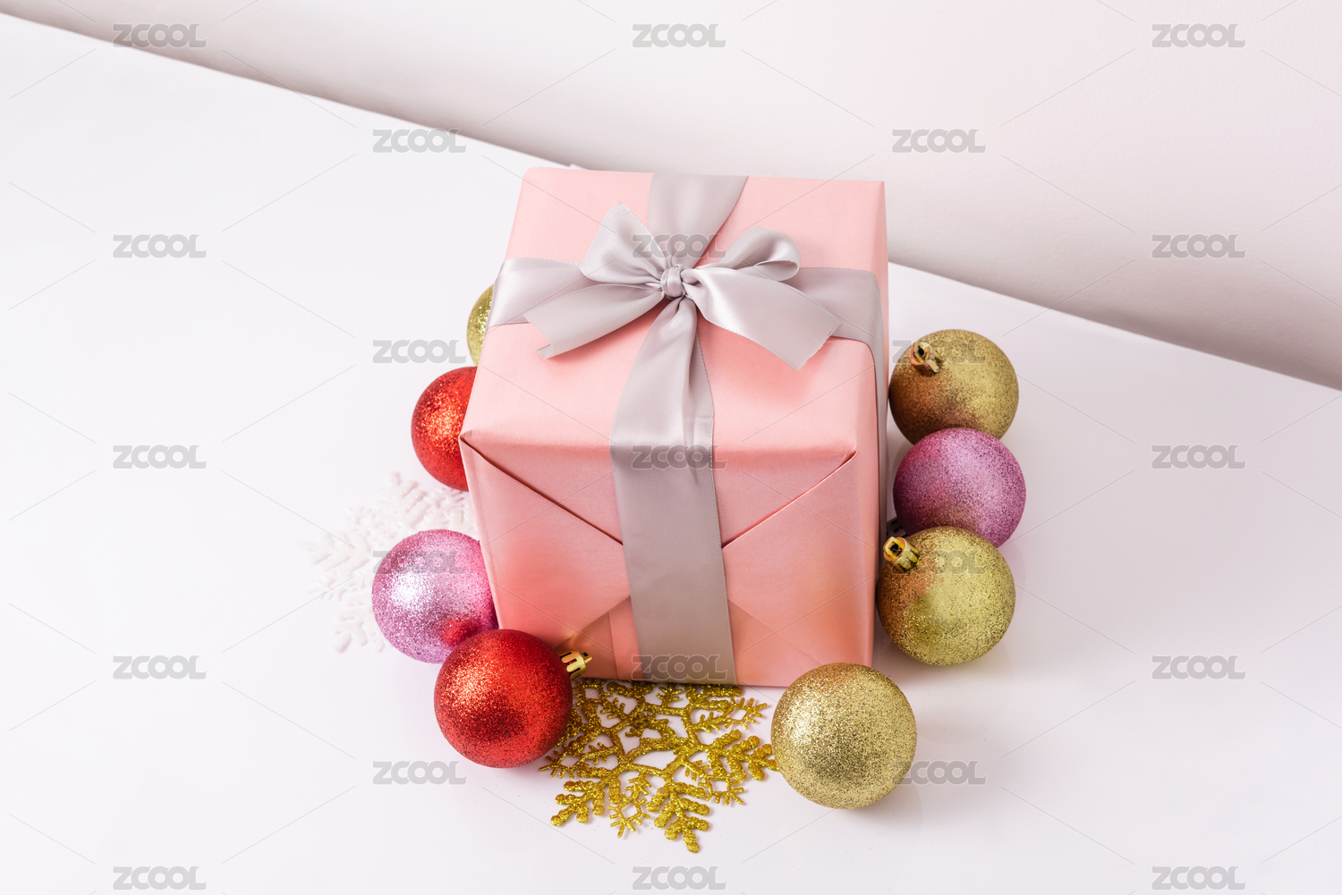 粉色的圣诞礼盒和圣诞球在白色背景上