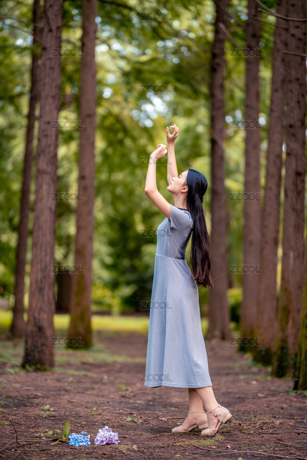 身穿蓝色的长裙的漂亮女生站在树林里伸懒腰