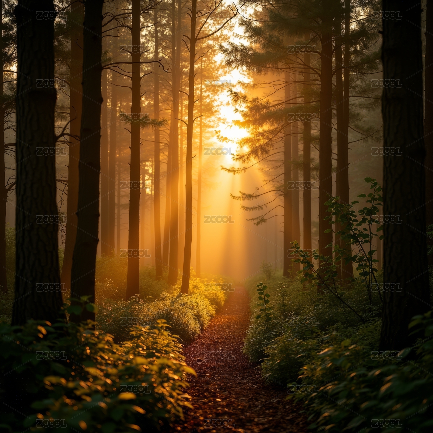 清晨的阳光穿透了森林里的薄雾,形成一束束光