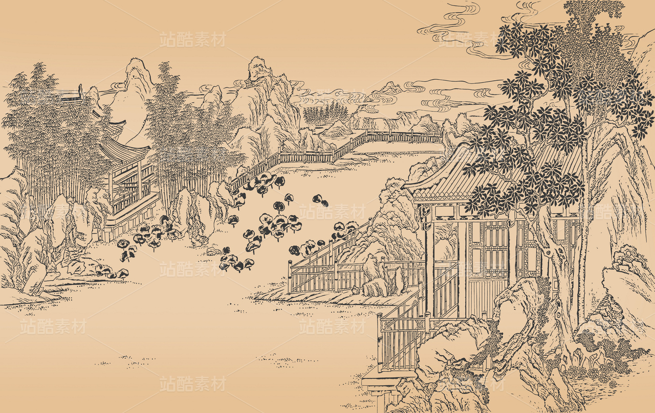 新中式国风亭台楼阁建筑工装背景墙壁画