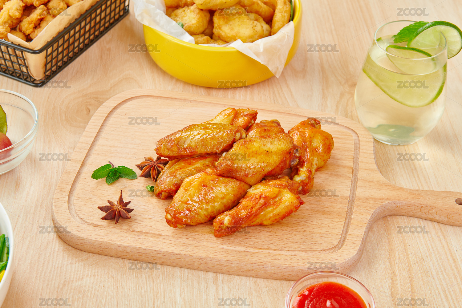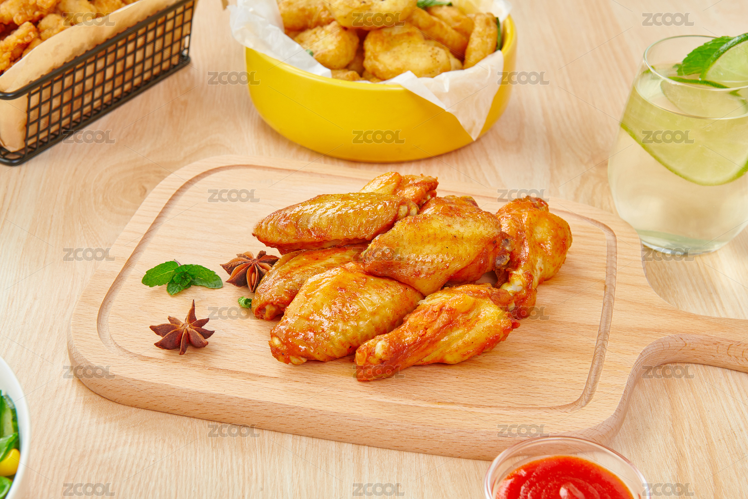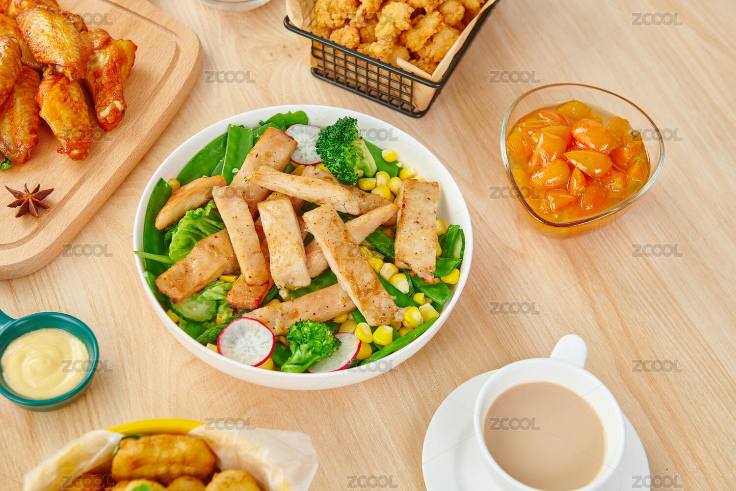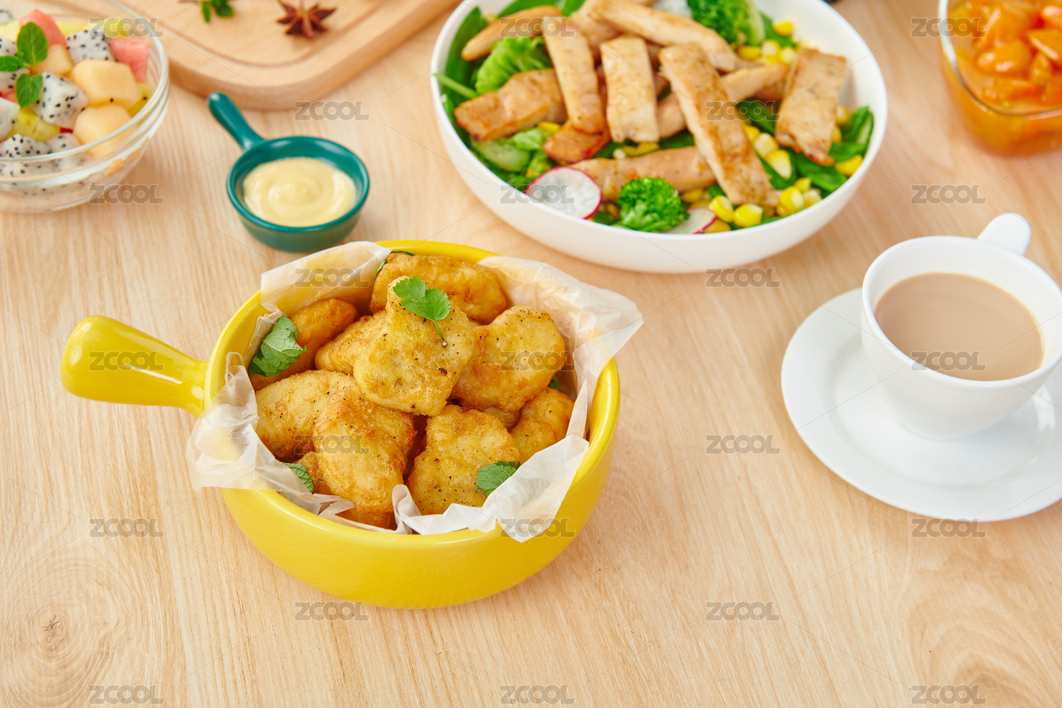 餐桌上美味的美食午餐鸡胸肉,鸡米花和鸡翅