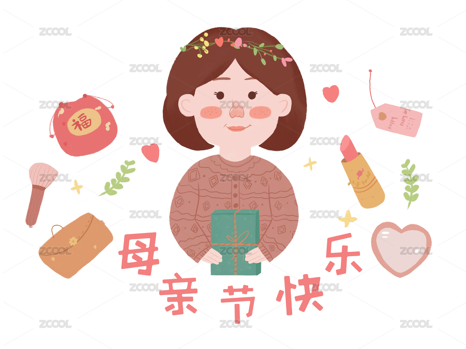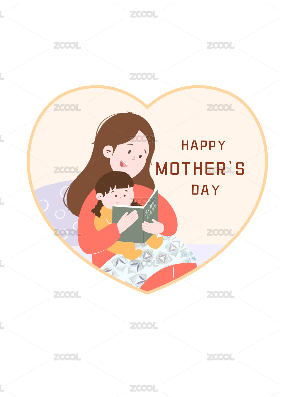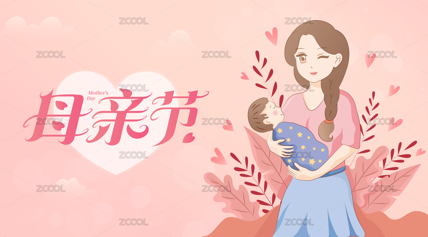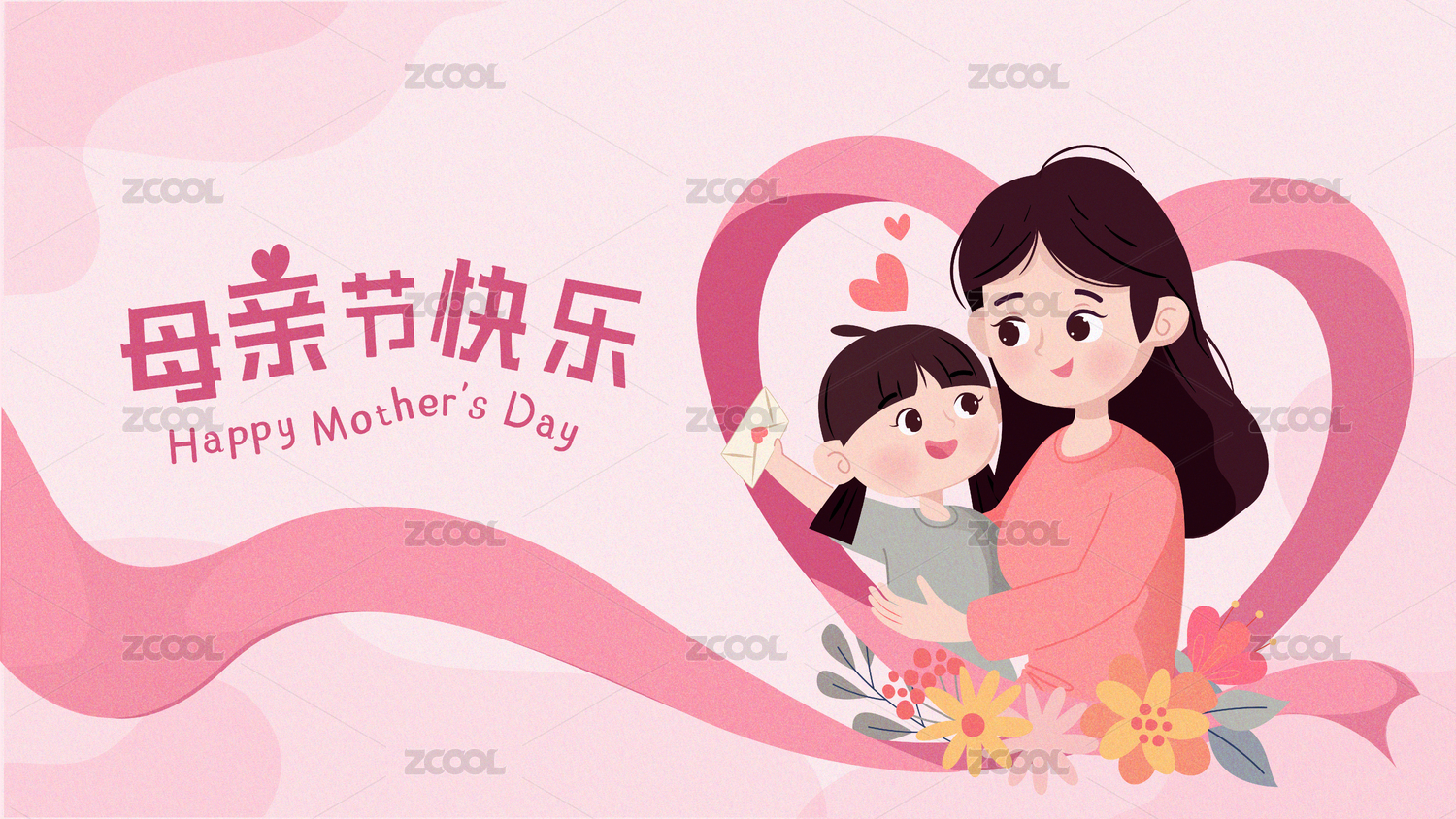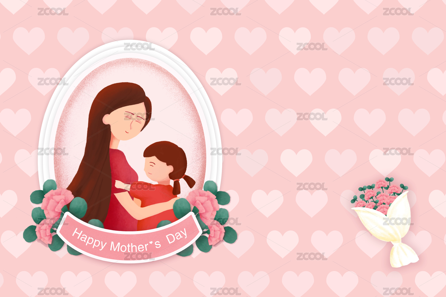 母亲节插画,粉色爱心背景妈妈拥抱女儿