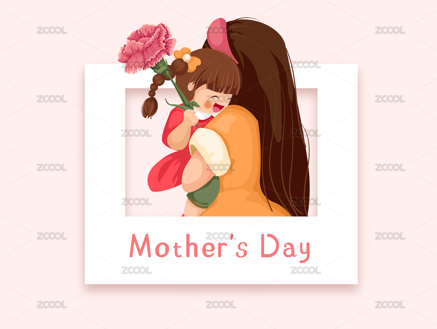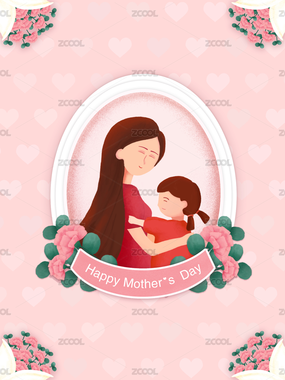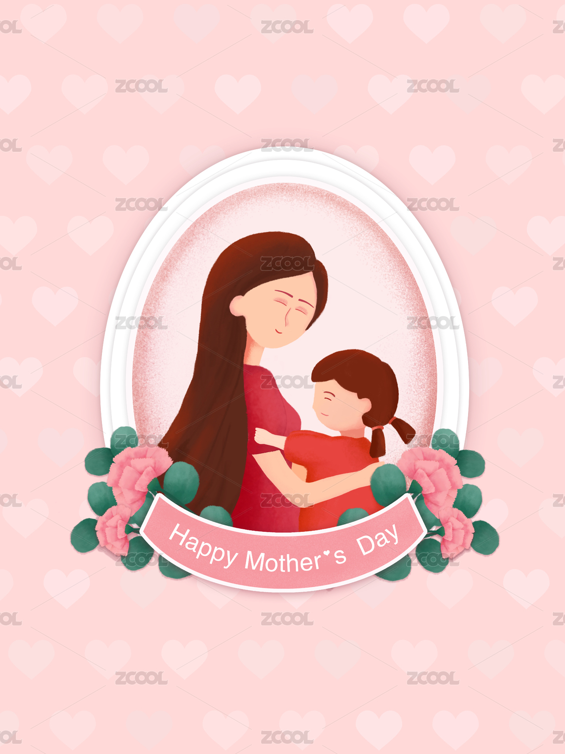 母亲节插画,康乃馨椭圆相架里妈妈拥抱女儿