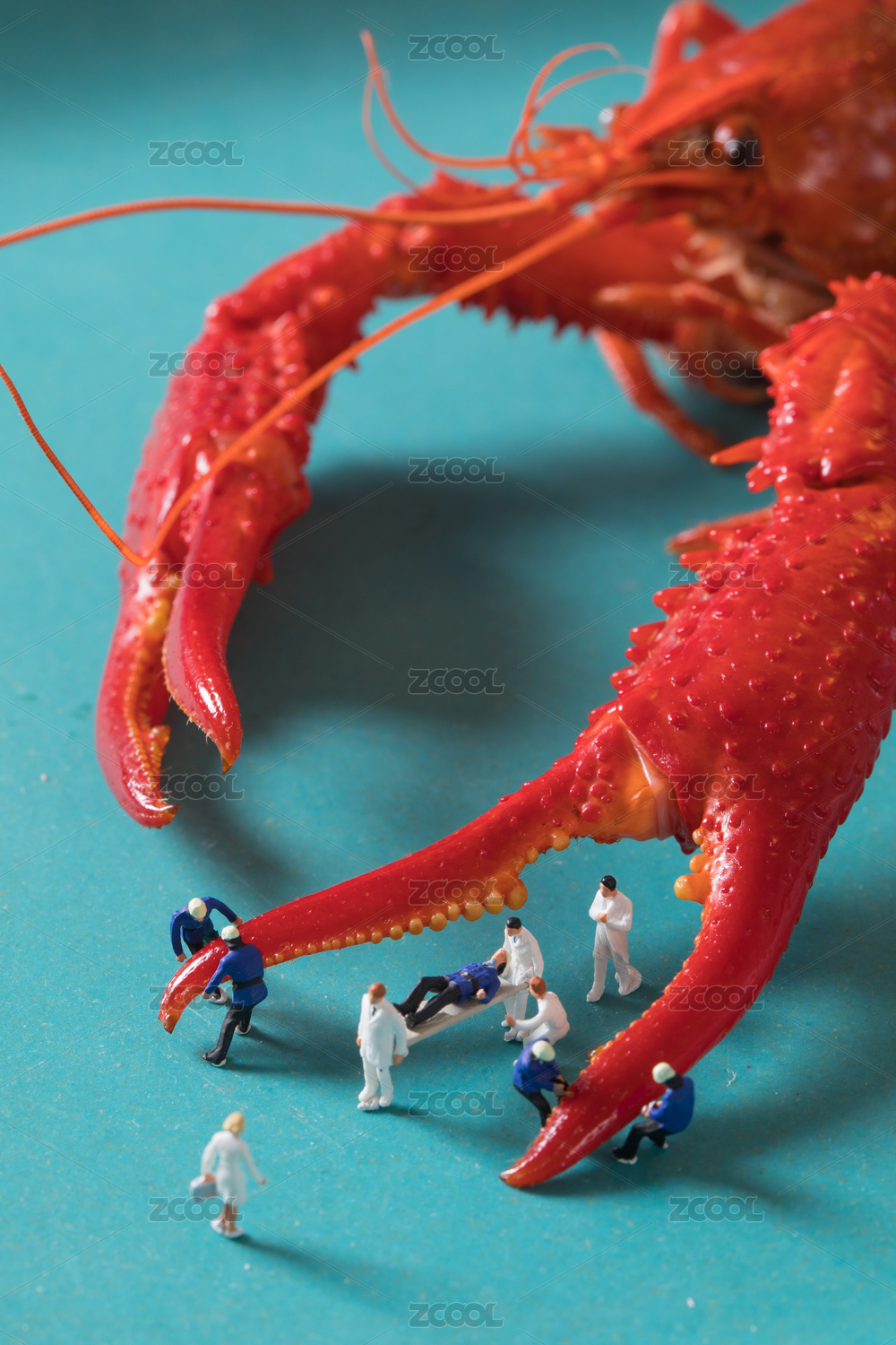 迷你小人和小龙虾 微拍小龙虾 缩微摄影小龙虾