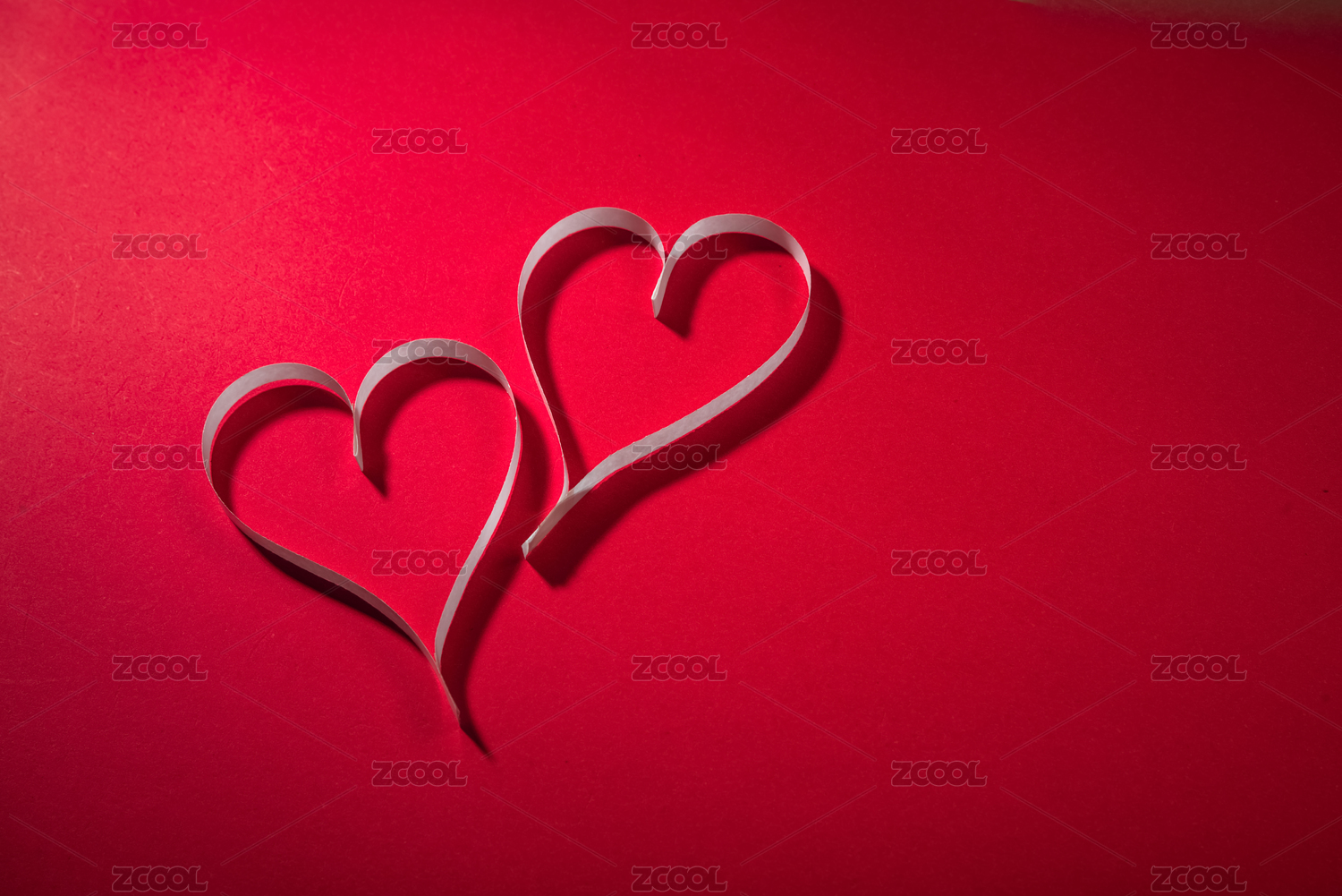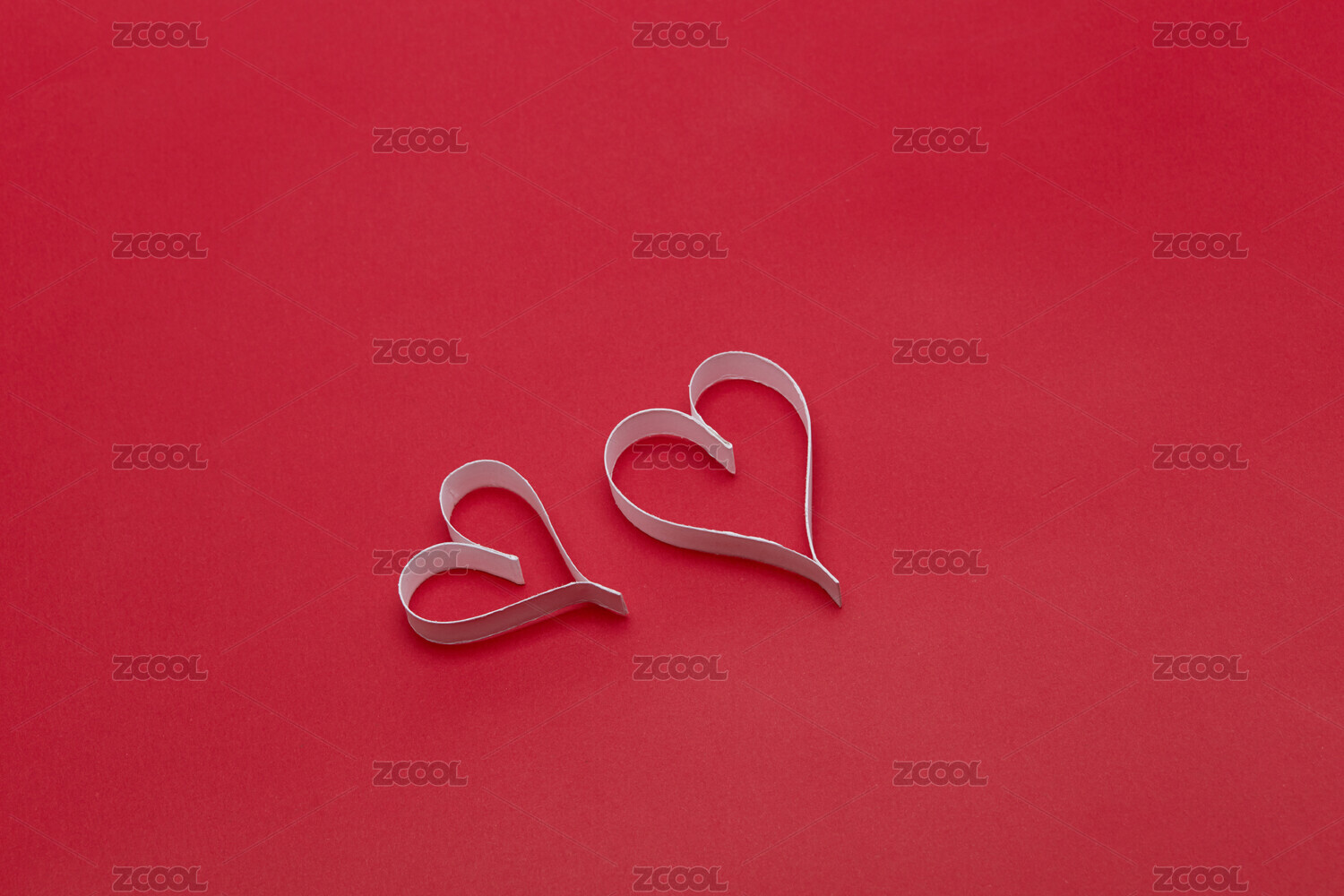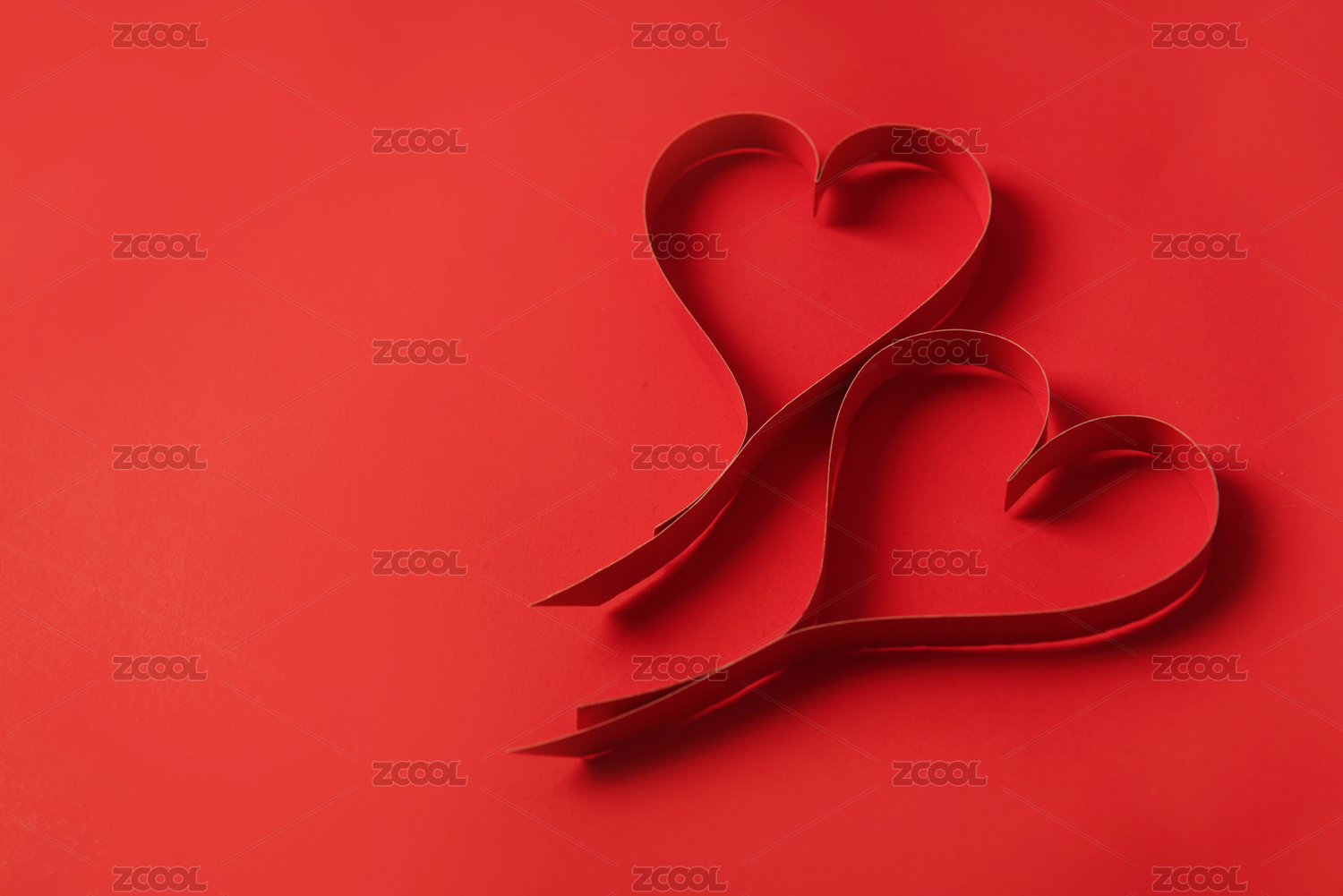 情人节红色背景上的两个浪漫心形红色剪纸