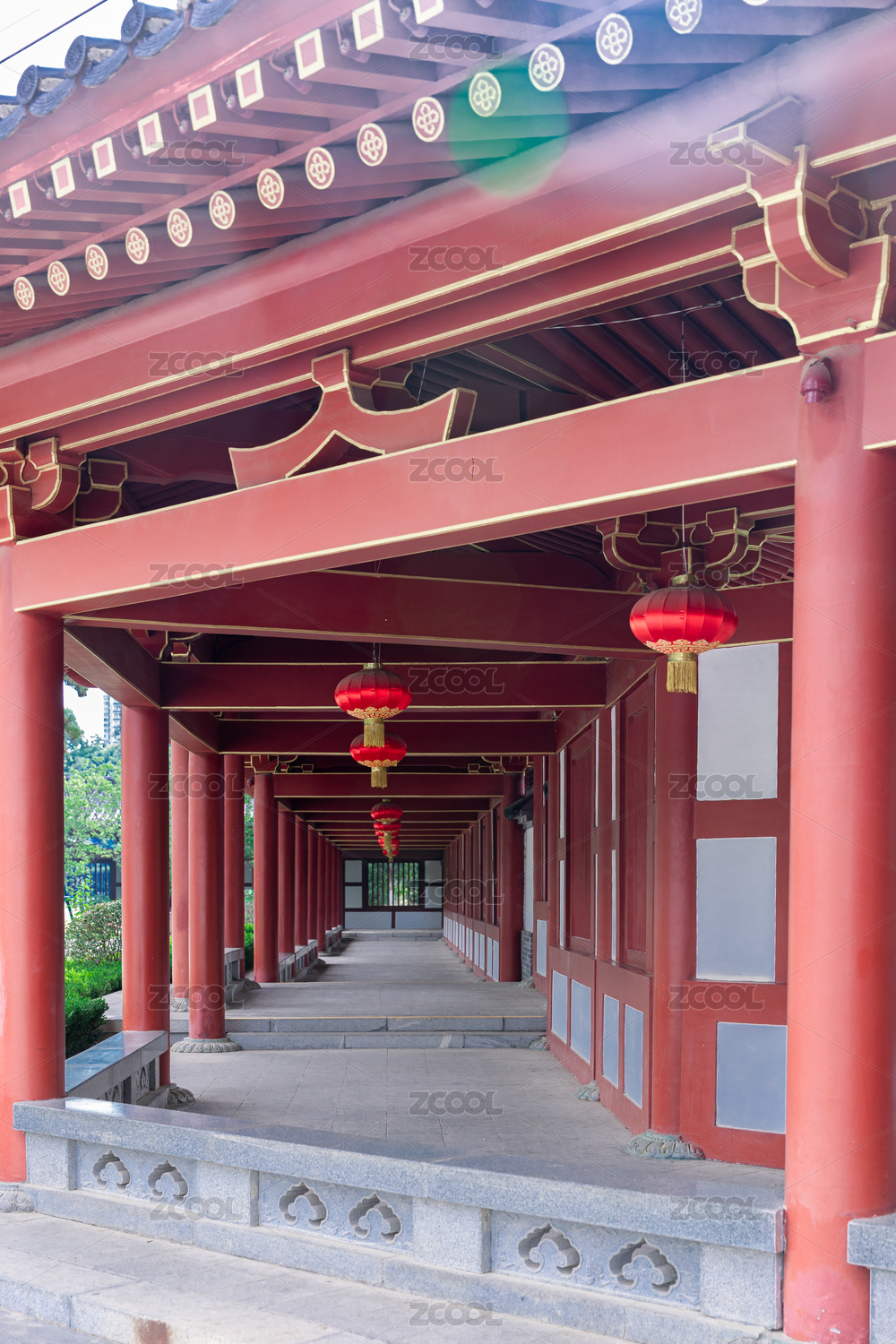 中国广东省佛山祖庙岭南古建筑庭院走廊的红漆柱子