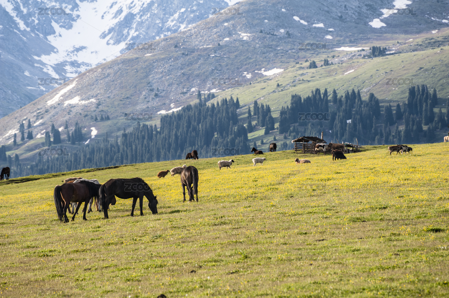 中国新疆伊犁库尔德宁草原高山草甸马吃草