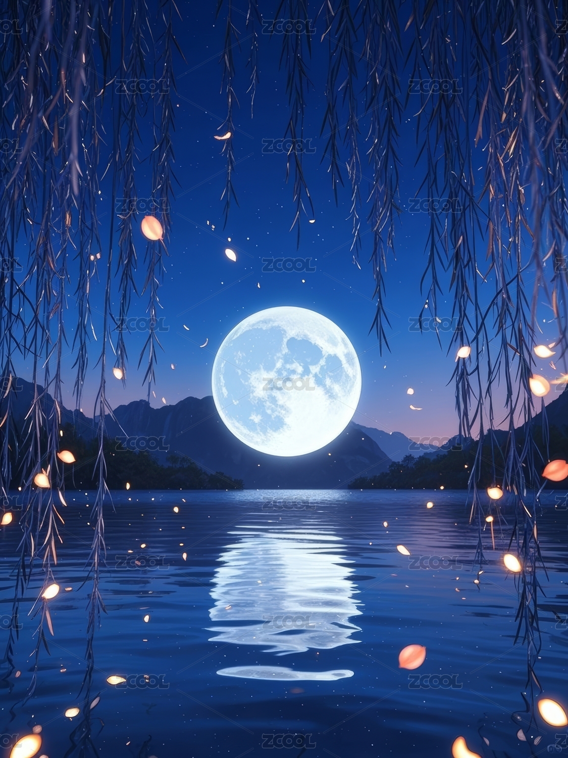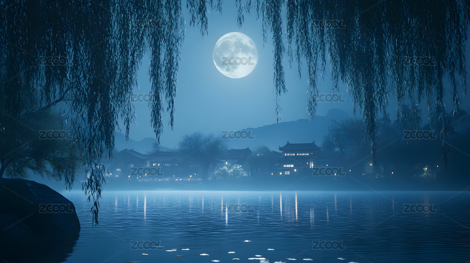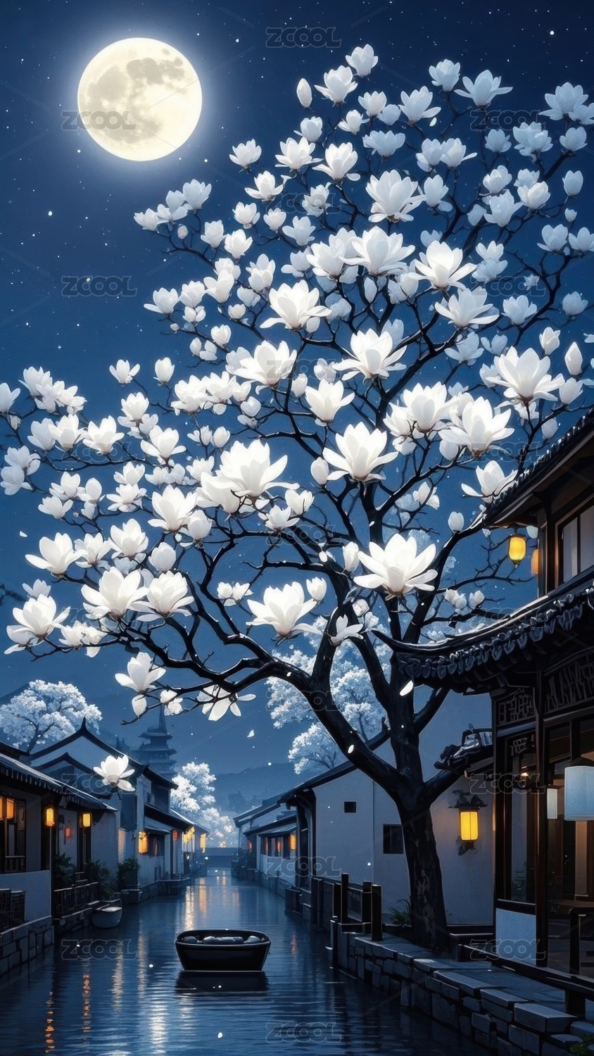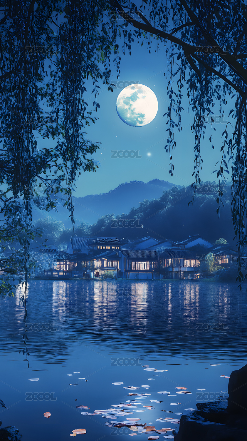 3D,AI数字艺术,夜景,房屋,月光,宁静,树木,意境,灯光,古镇