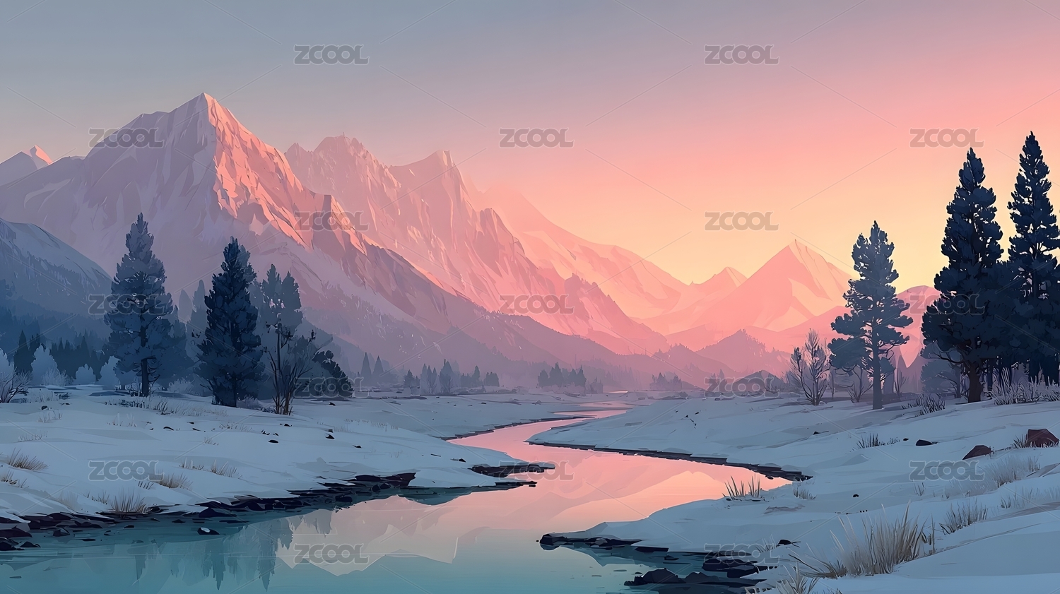 雪山下的宁静河谷 冰雪消融的山水画卷