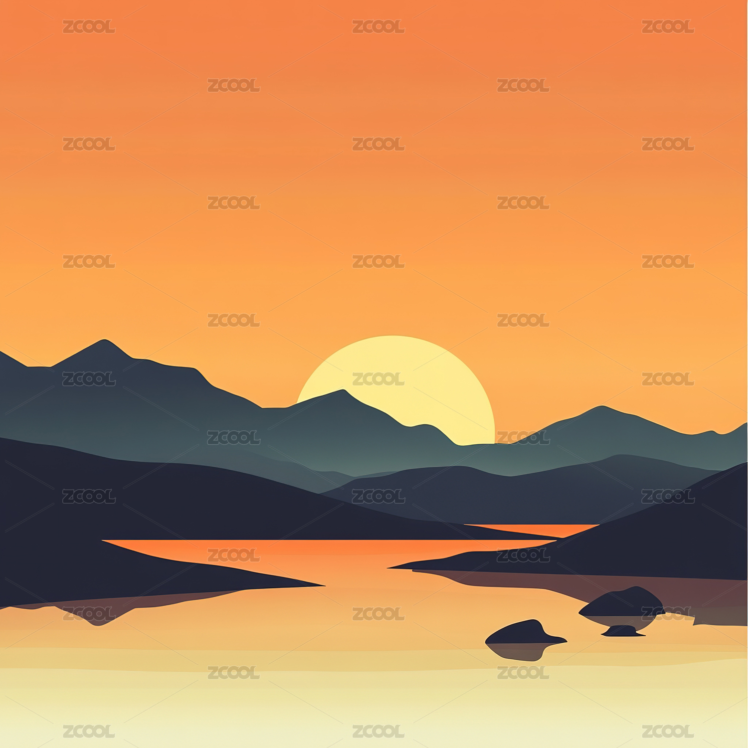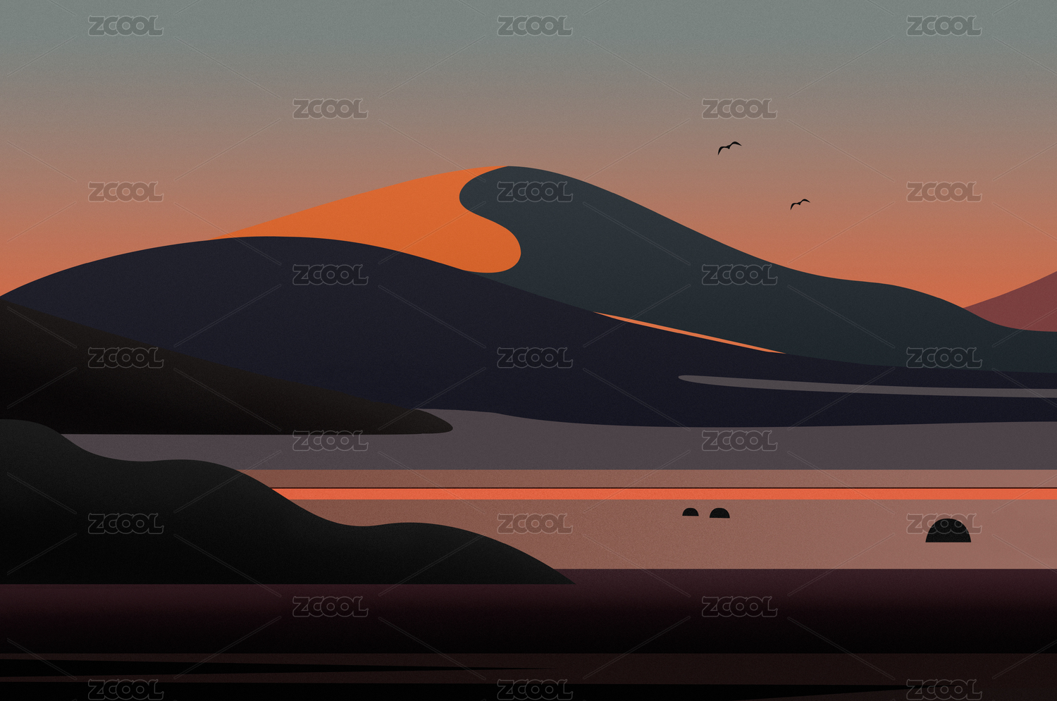 沙漠山脉黄昏剪影概念插画