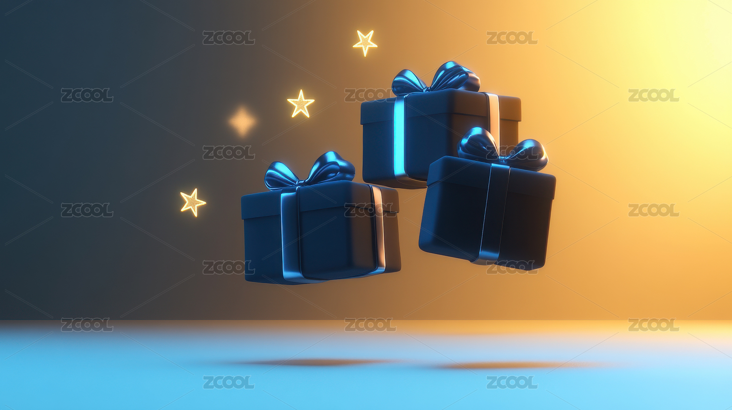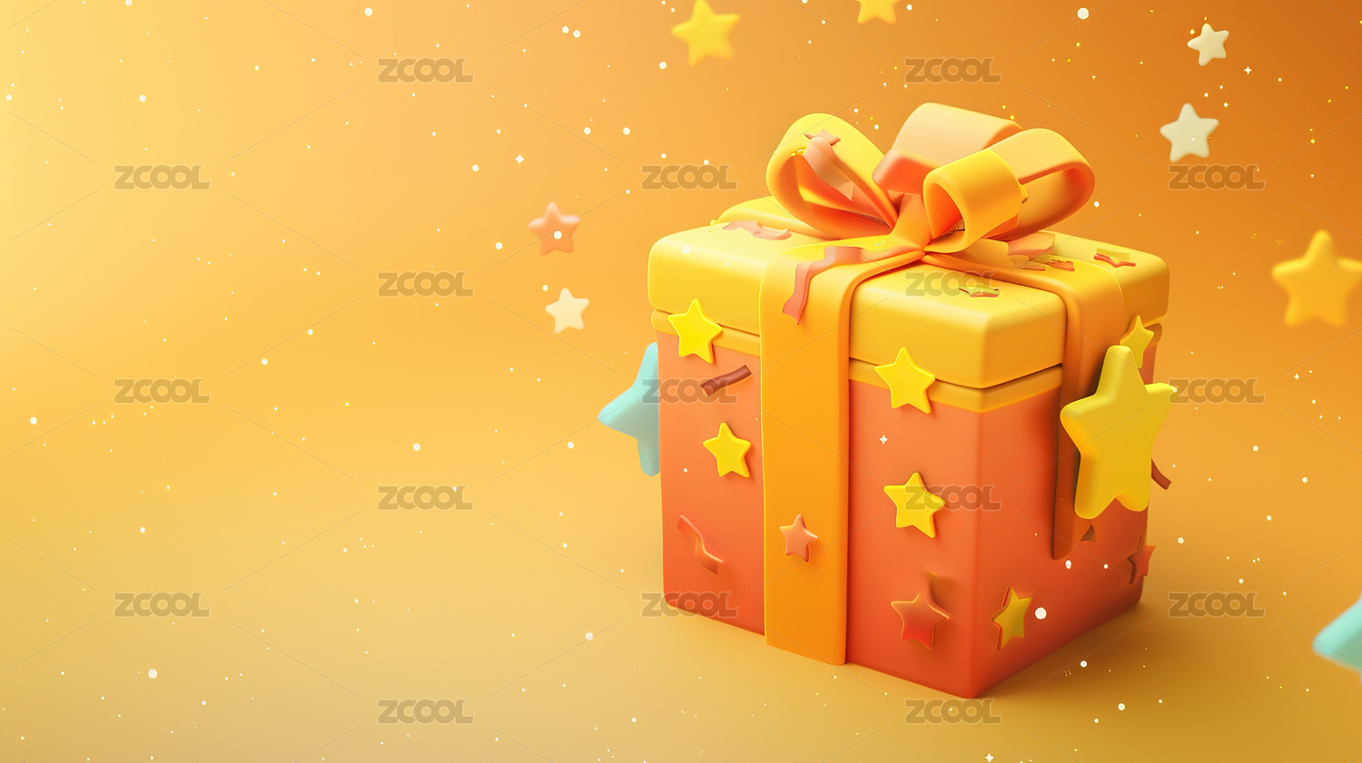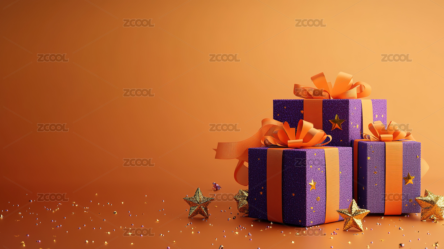 绑着黄色蝴蝶结的紫色礼盒,周围散落着五角