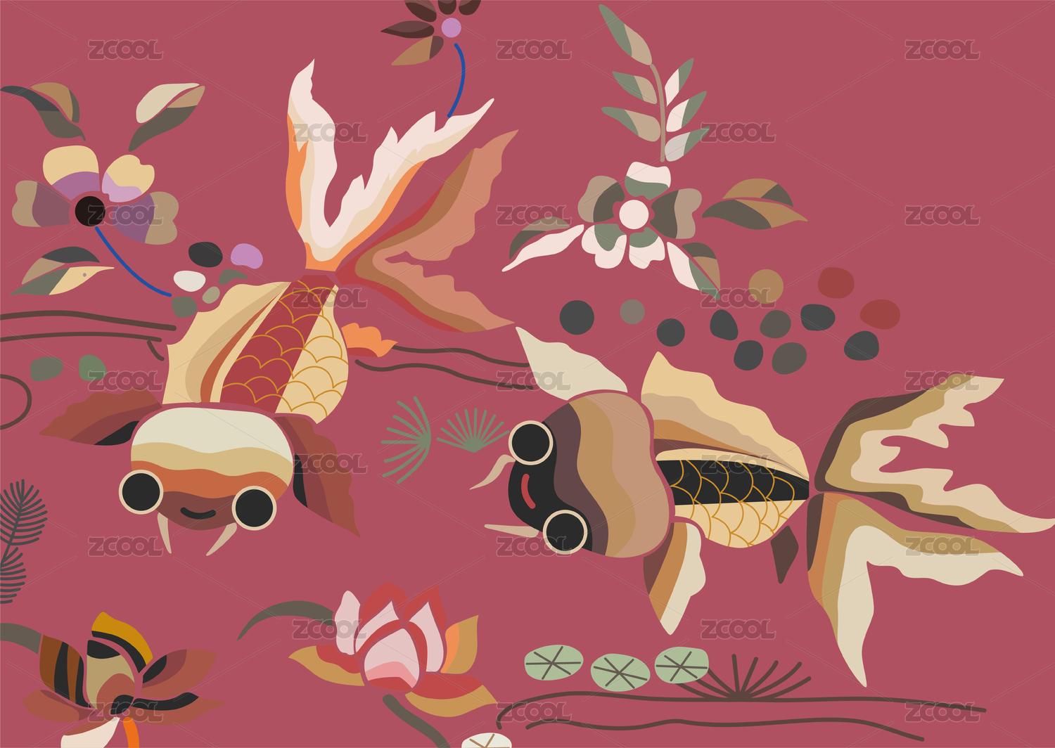 站酷纹样-清-双鱼戏花金鱼纹