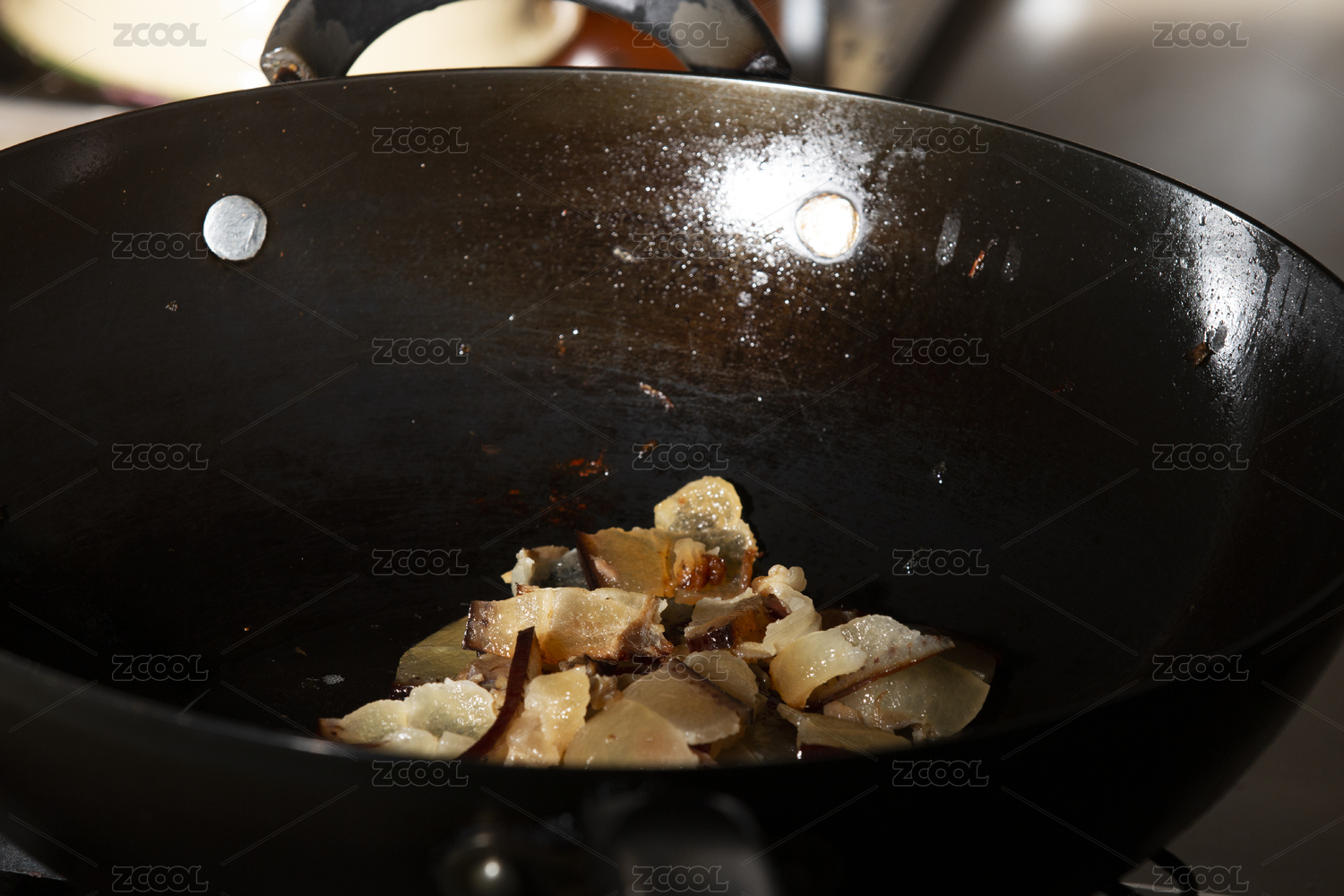 锅中正在煎油的腊肉