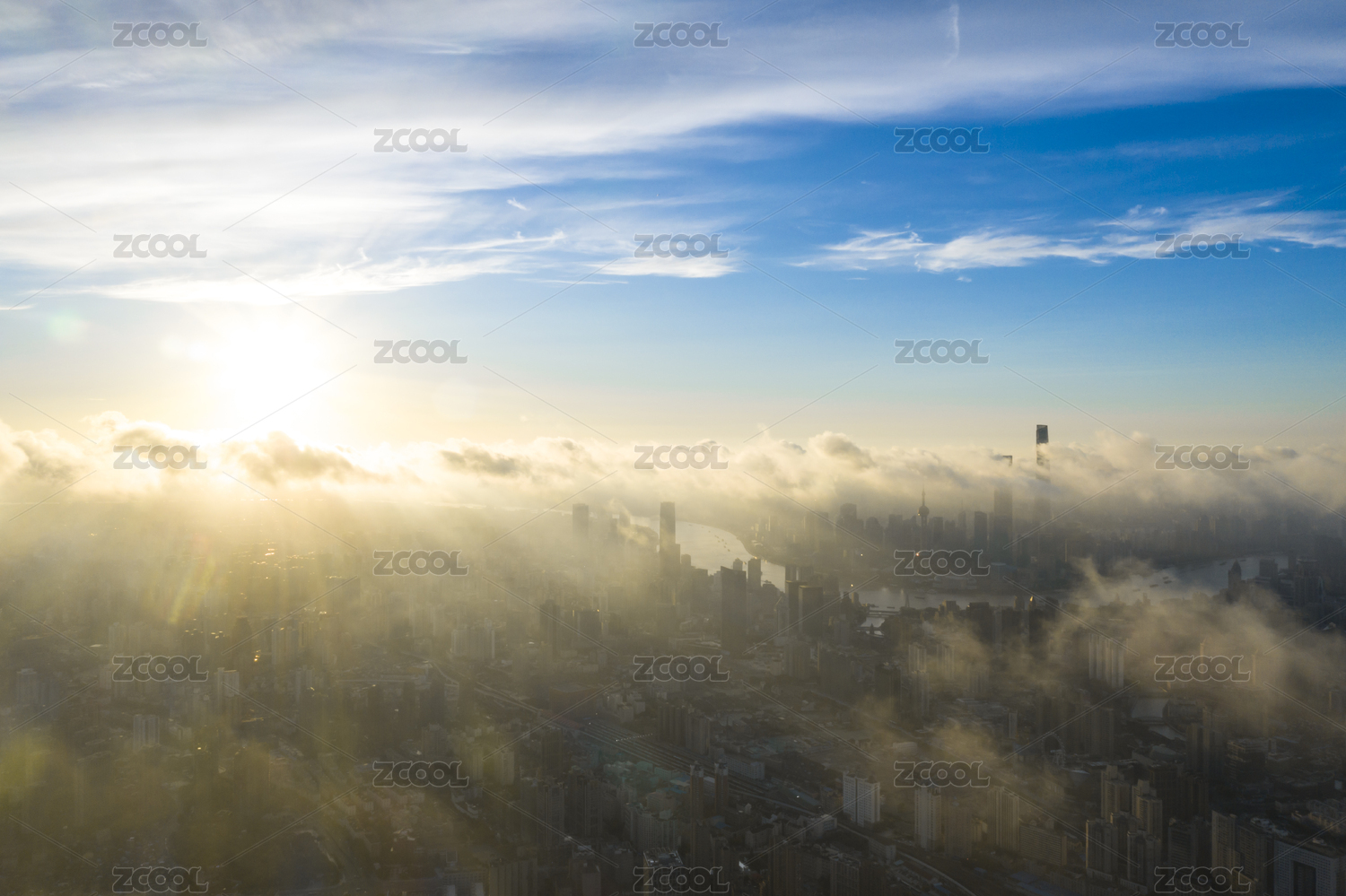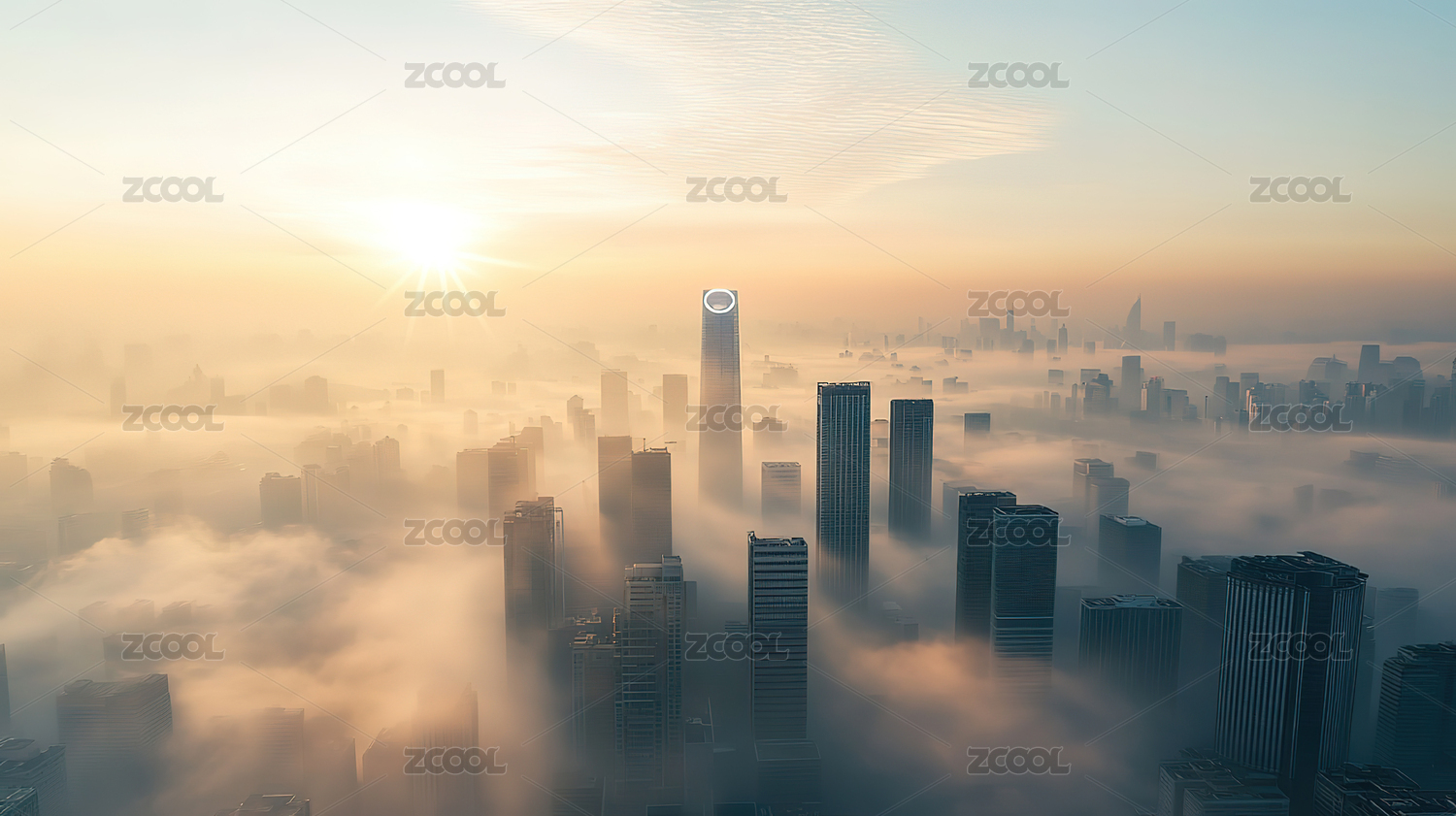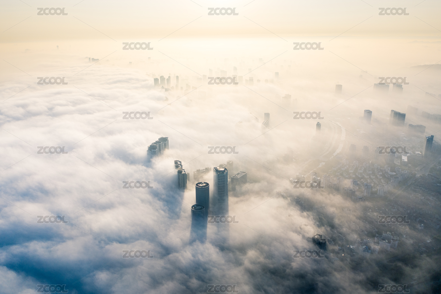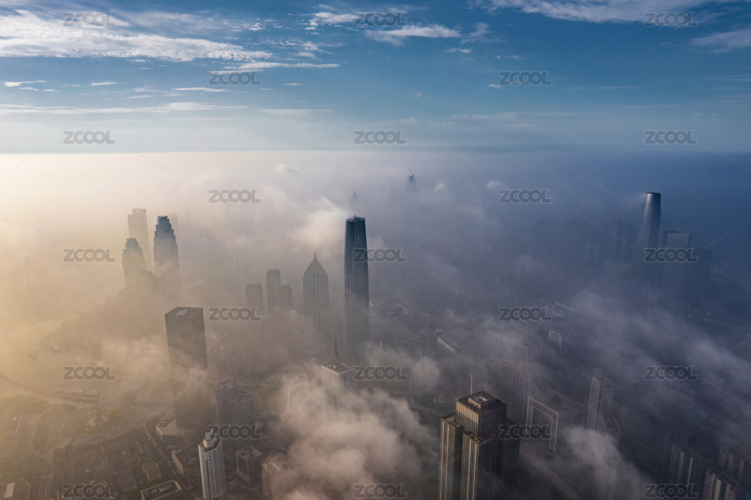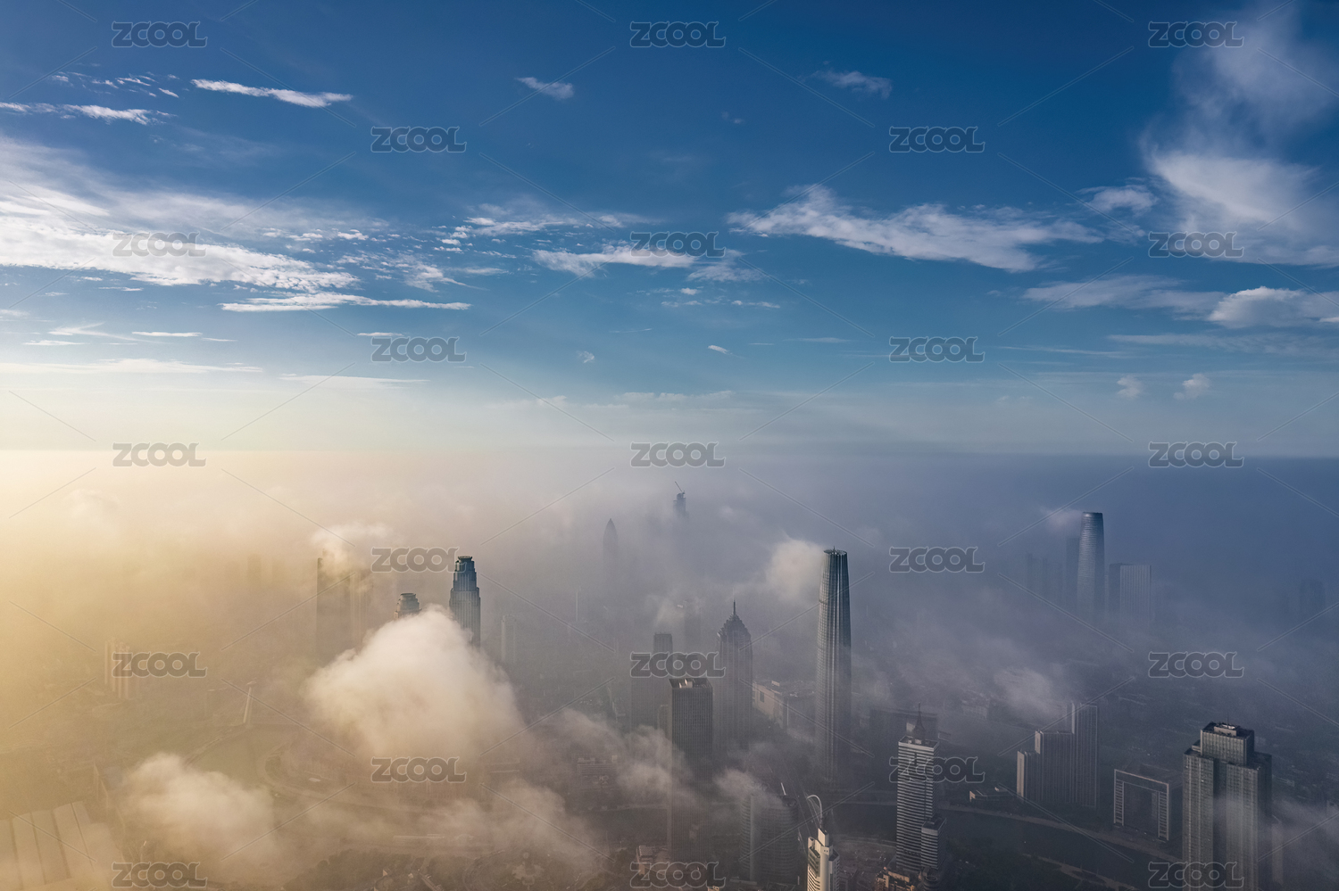 广州珠江岸城市高楼与云雾缭绕风光航拍