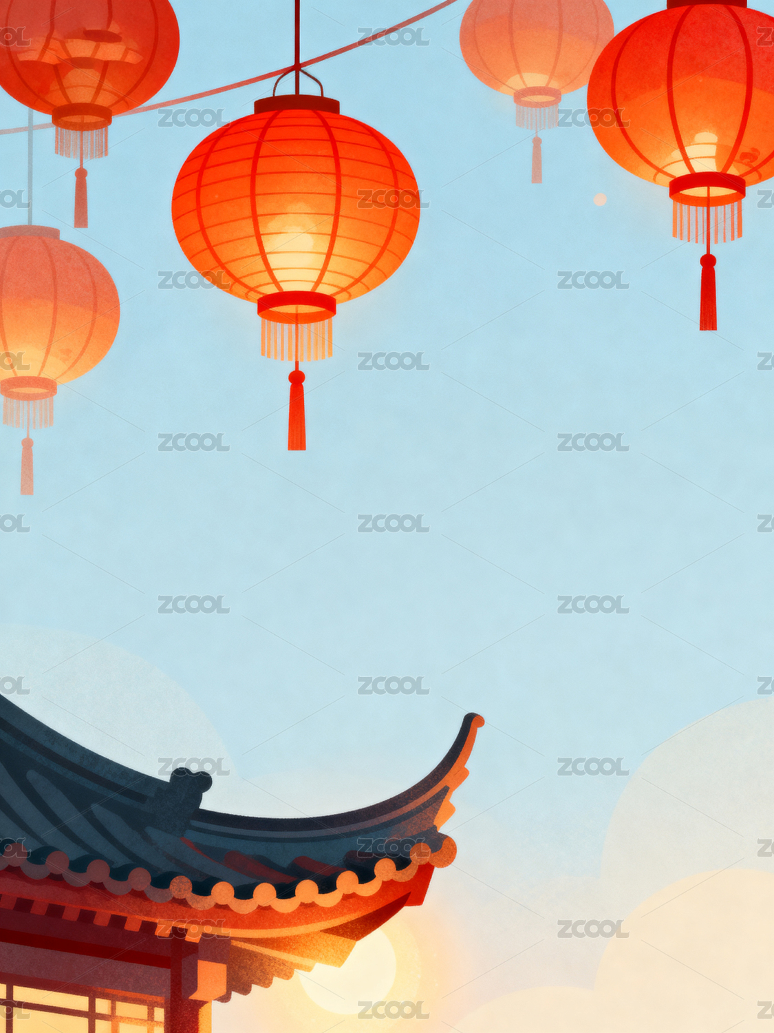 夜晚挂着传统红灯笼的中国古典建筑插画绘画