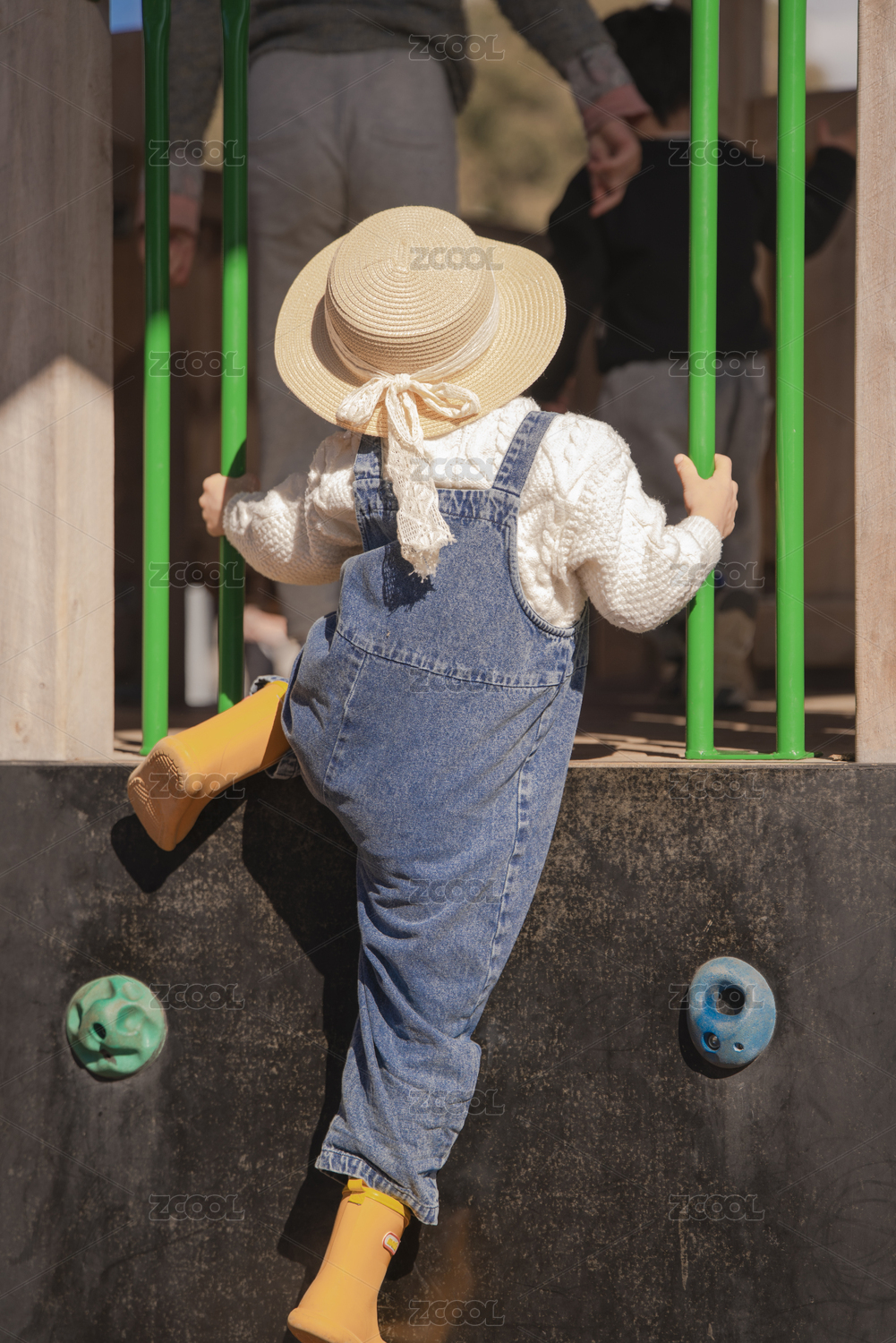 勇敢小男孩在游乐场攀爬铁框架