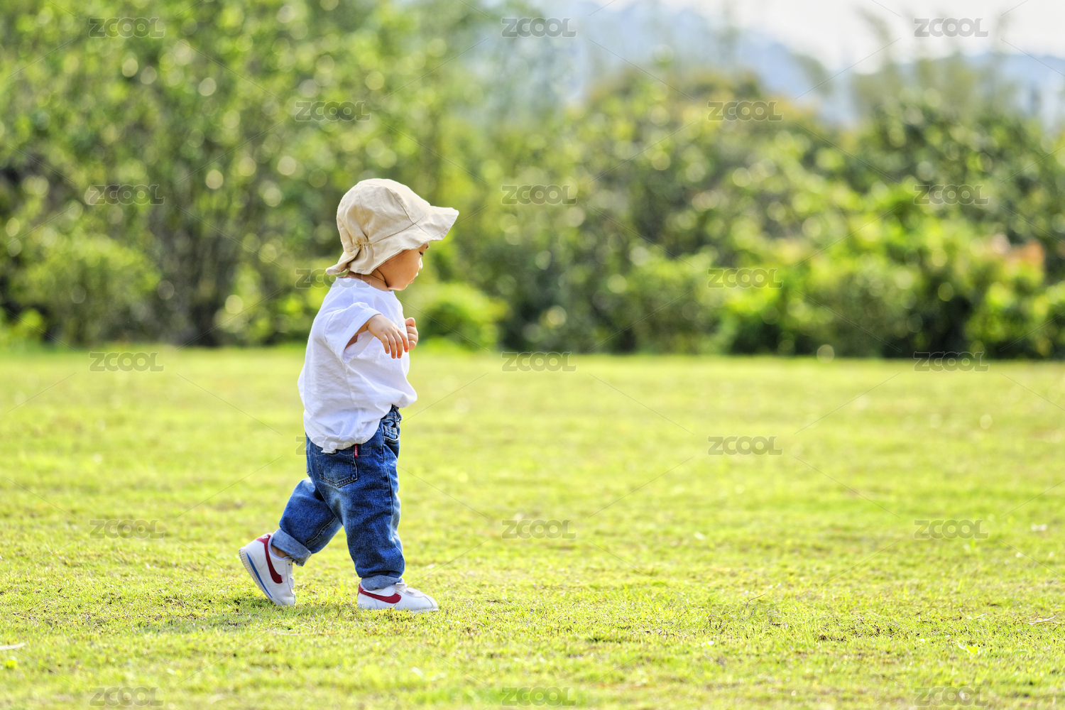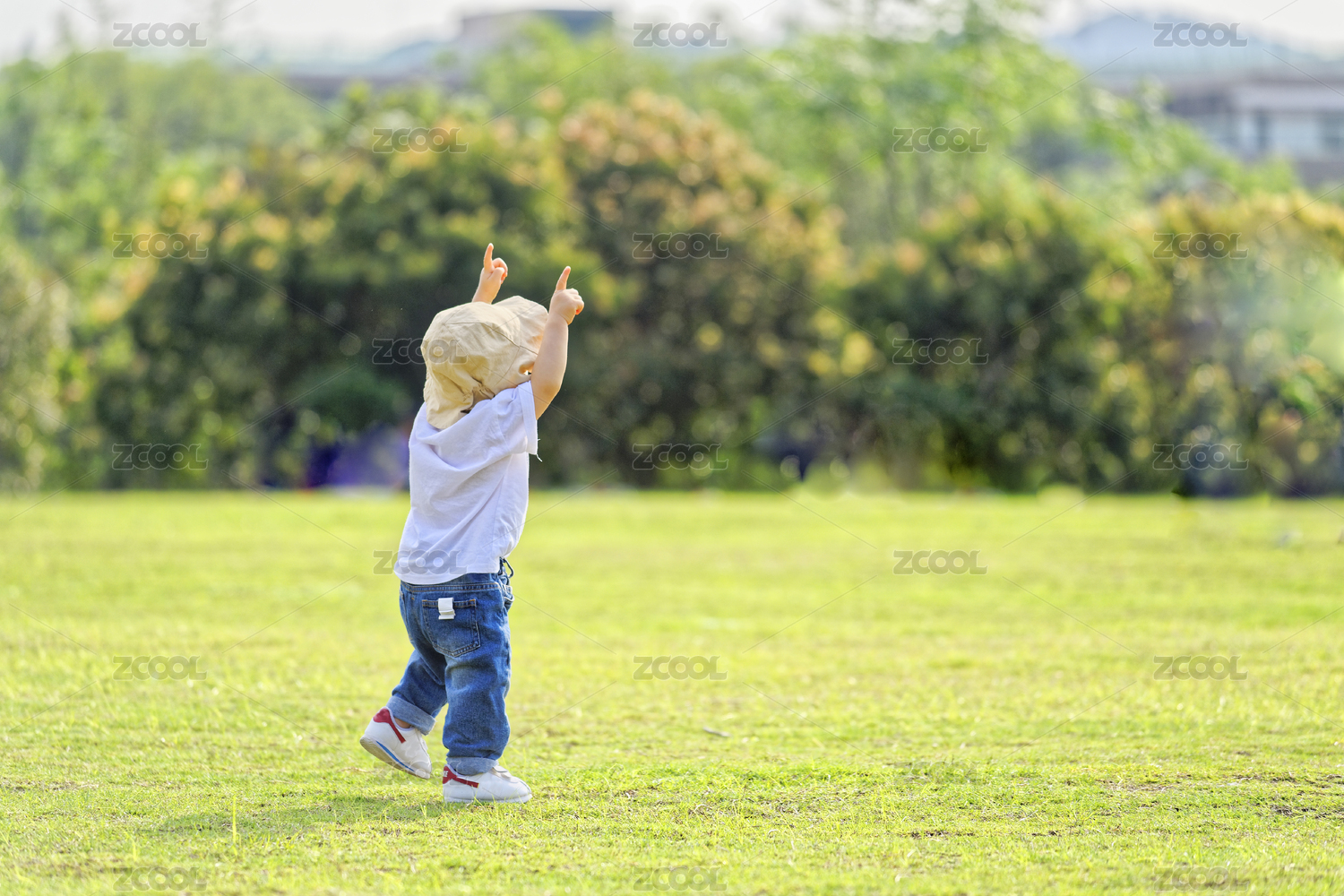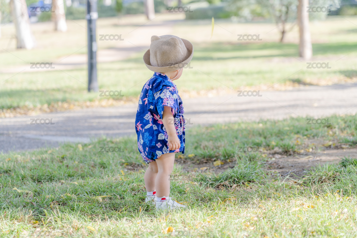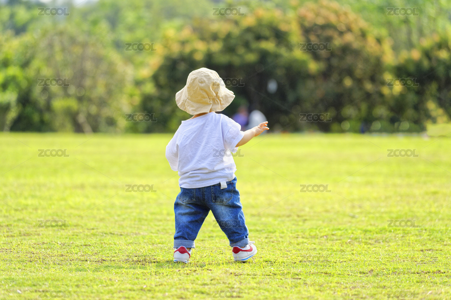 一个戴帽子的小男孩在绿色草地上玩耍
