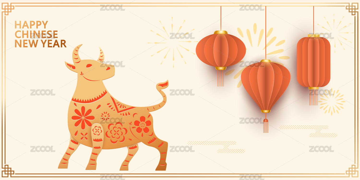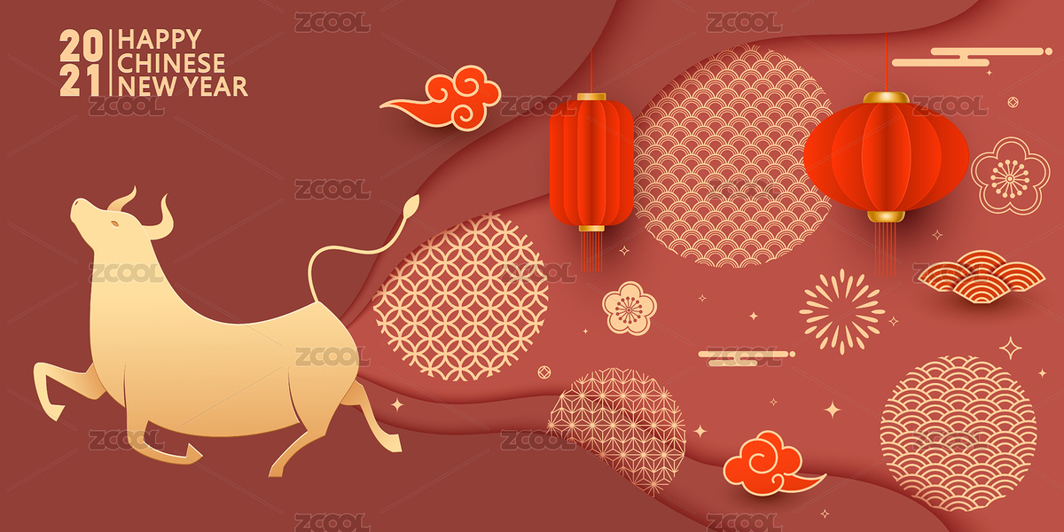 牛年新年中国风剪纸牛与云纹灯笼背景