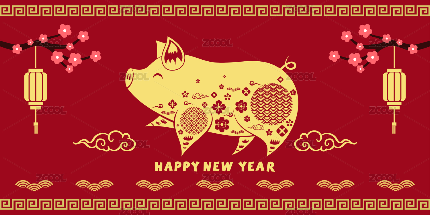 2019年猪年剪纸图案,中国传统图形符号,新年贺卡、海报、banner、横幅设计元素