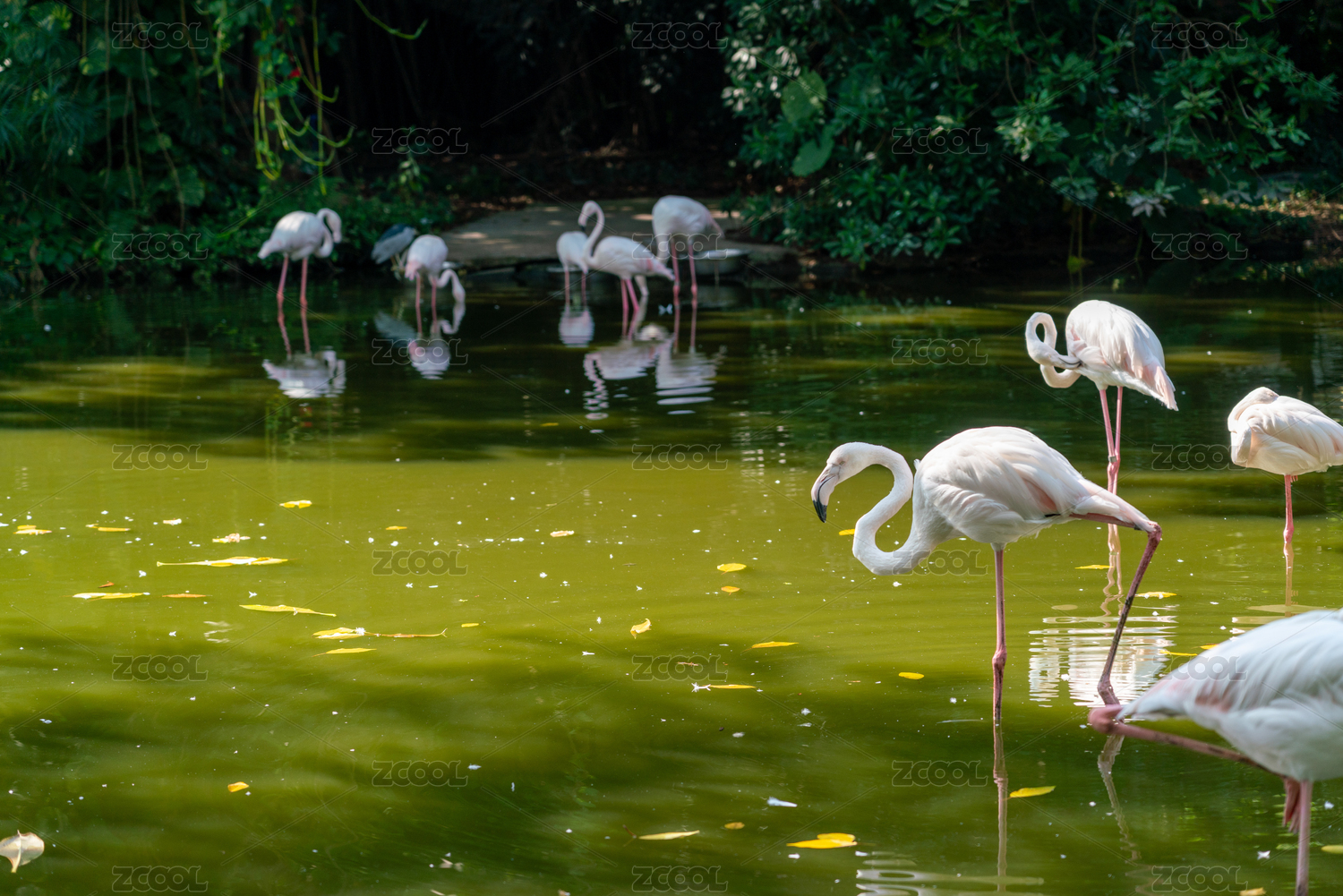 公园水池里的一群火烈鸟