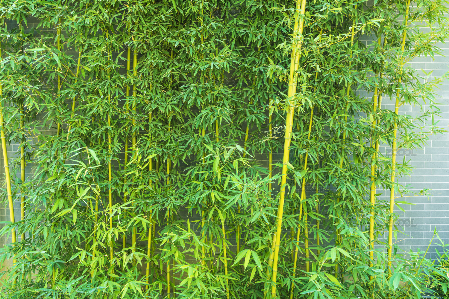 青砖墙边一丛翠绿的竹子