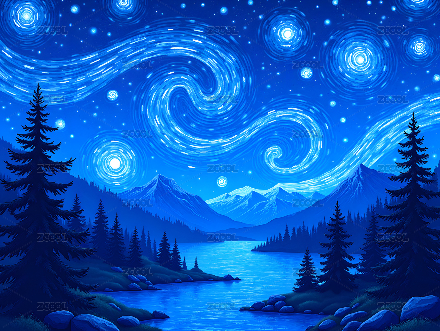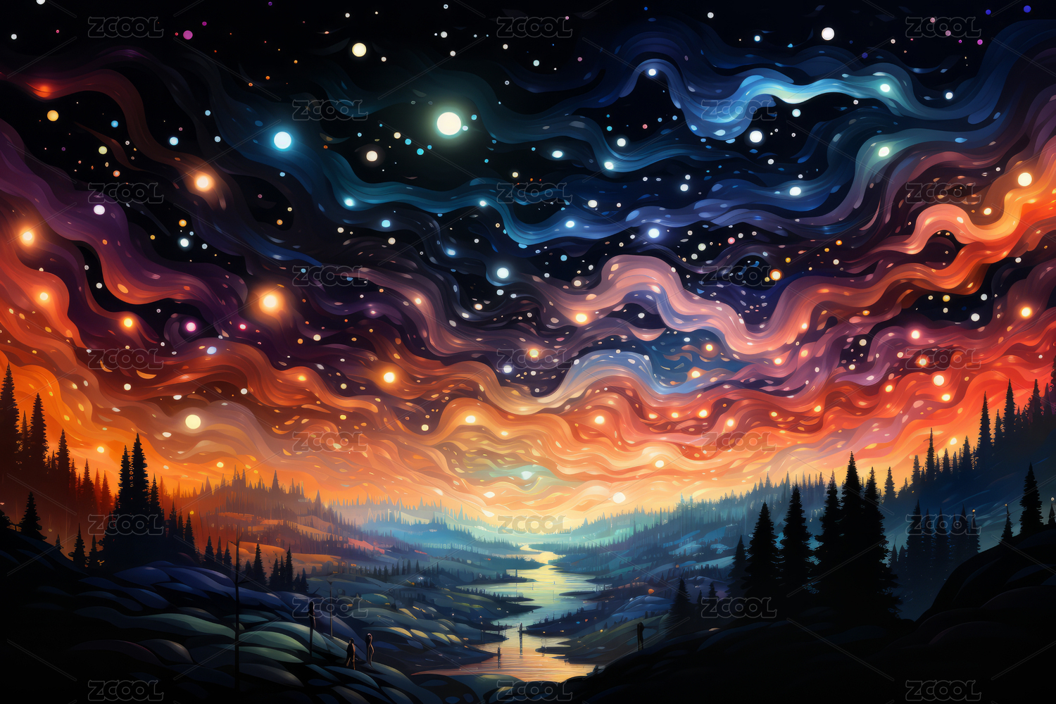 手绘唯美的抽象艺术感夜晚天空风景插画