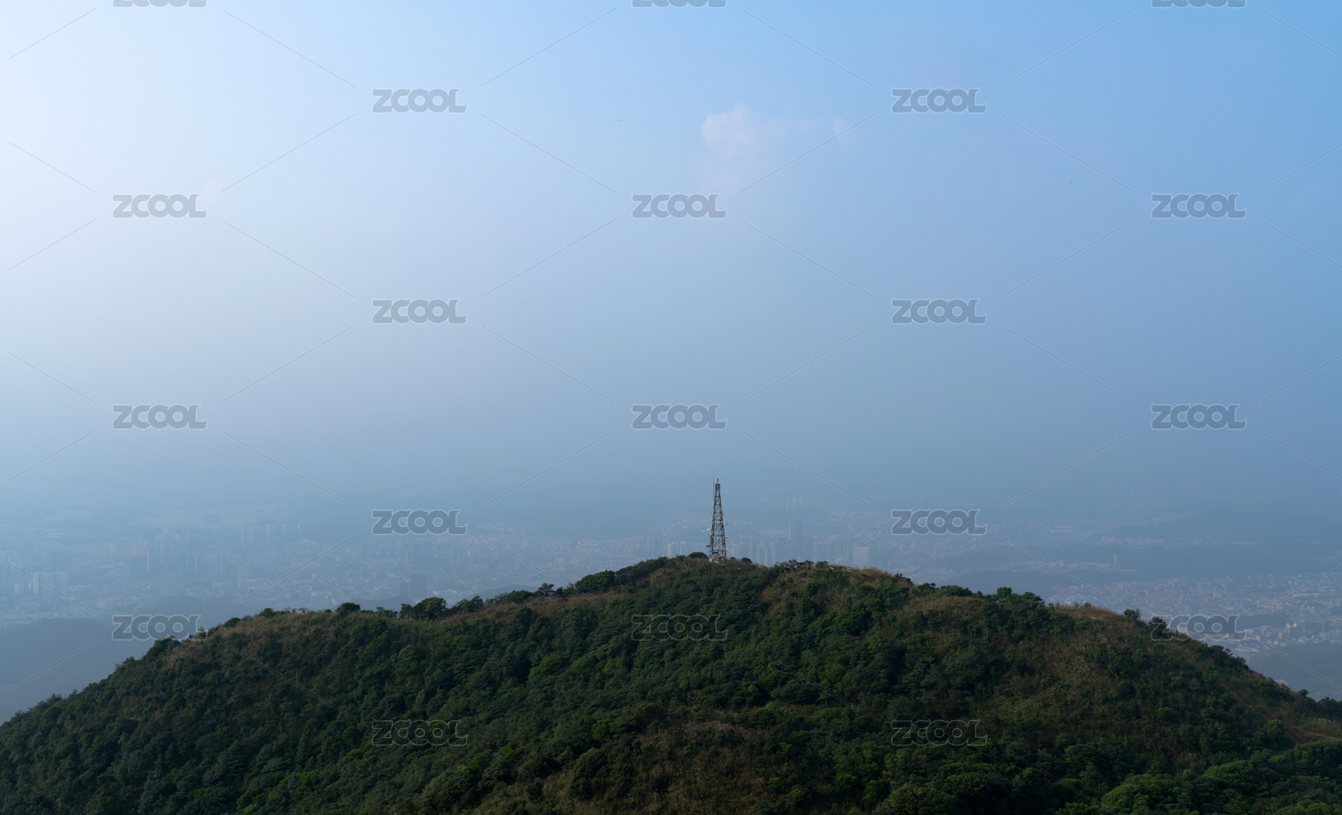 中国深圳,雾气弥漫下的蓝天青山与信号塔