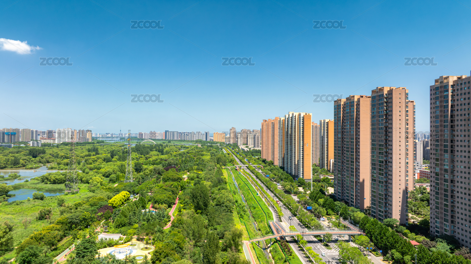 中国四川成都大源中央公园及周边建筑全景航拍图