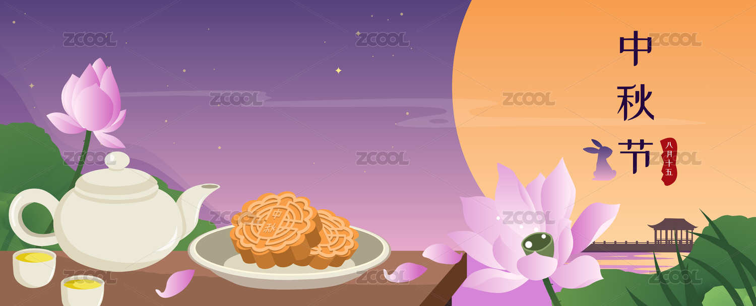 中国传统节日中秋节月亮荷花前桌上的月饼和