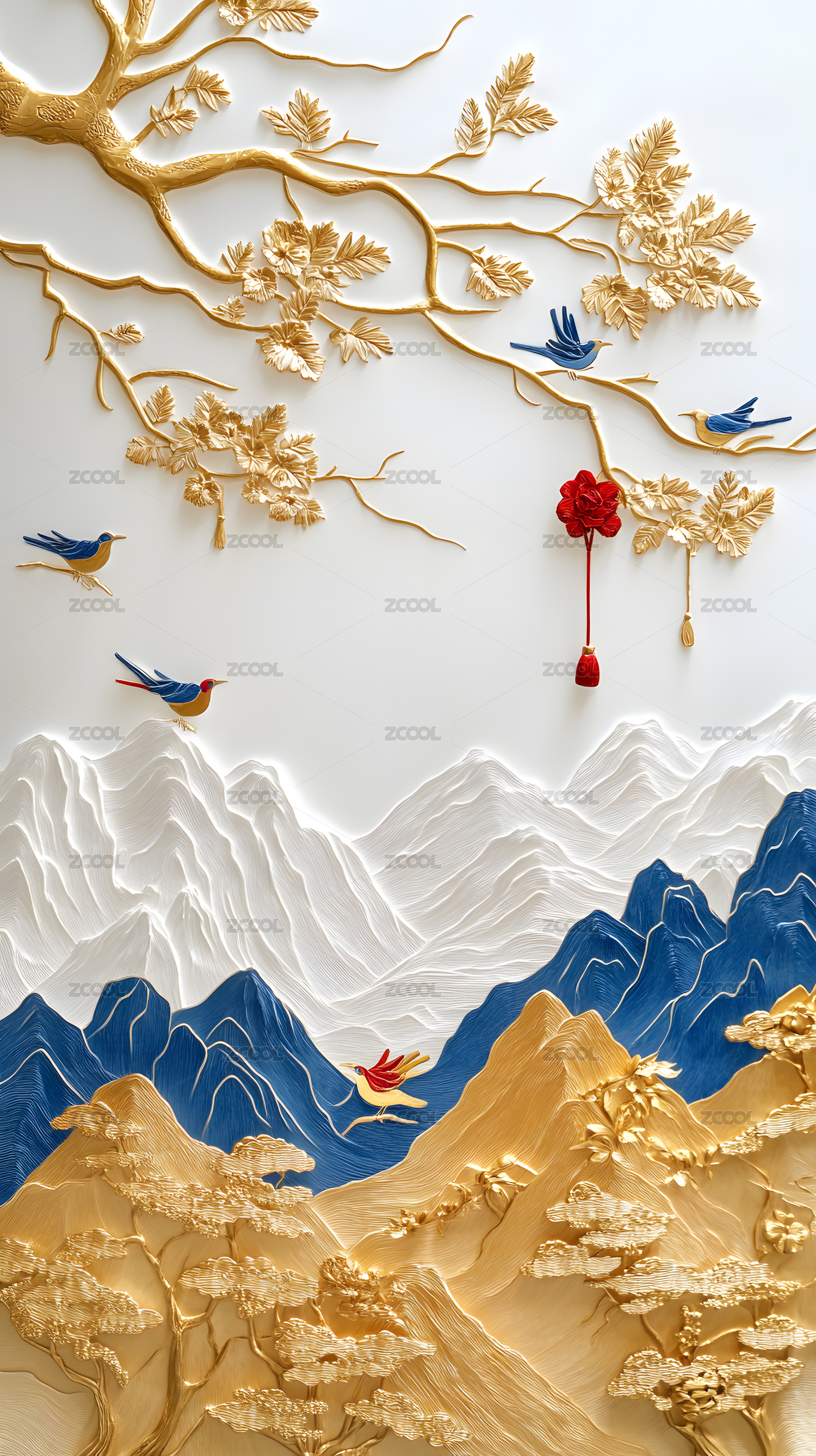 金色枝鸟山景3D浮雕艺术