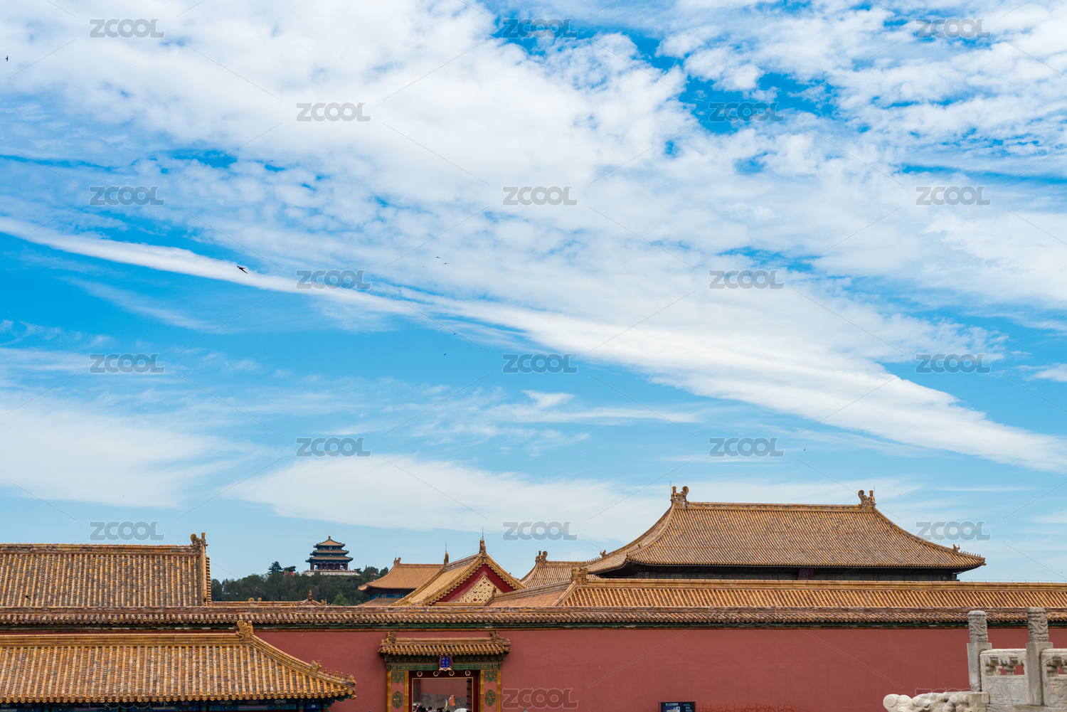 蓝天白云下北京故宫的歇山顶、红墙黄瓦