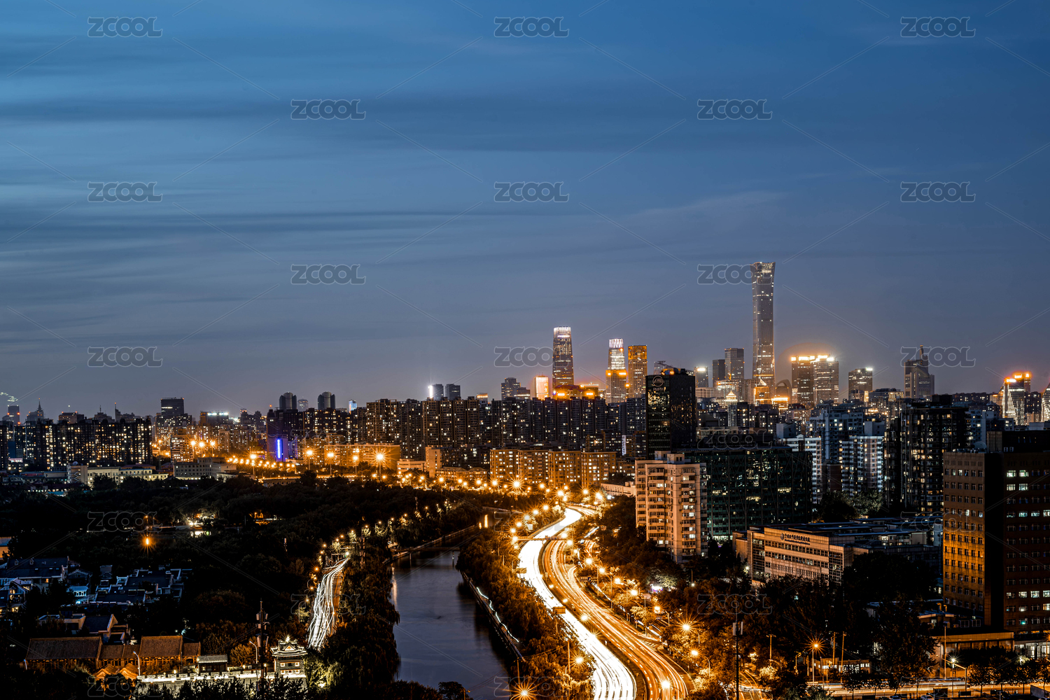 北京龙潭公园护城河与中国尊国贸城市夜景