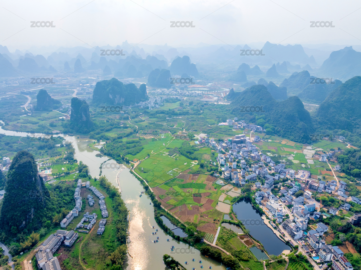 中国桂林美丽的山河自然景观鸟瞰图