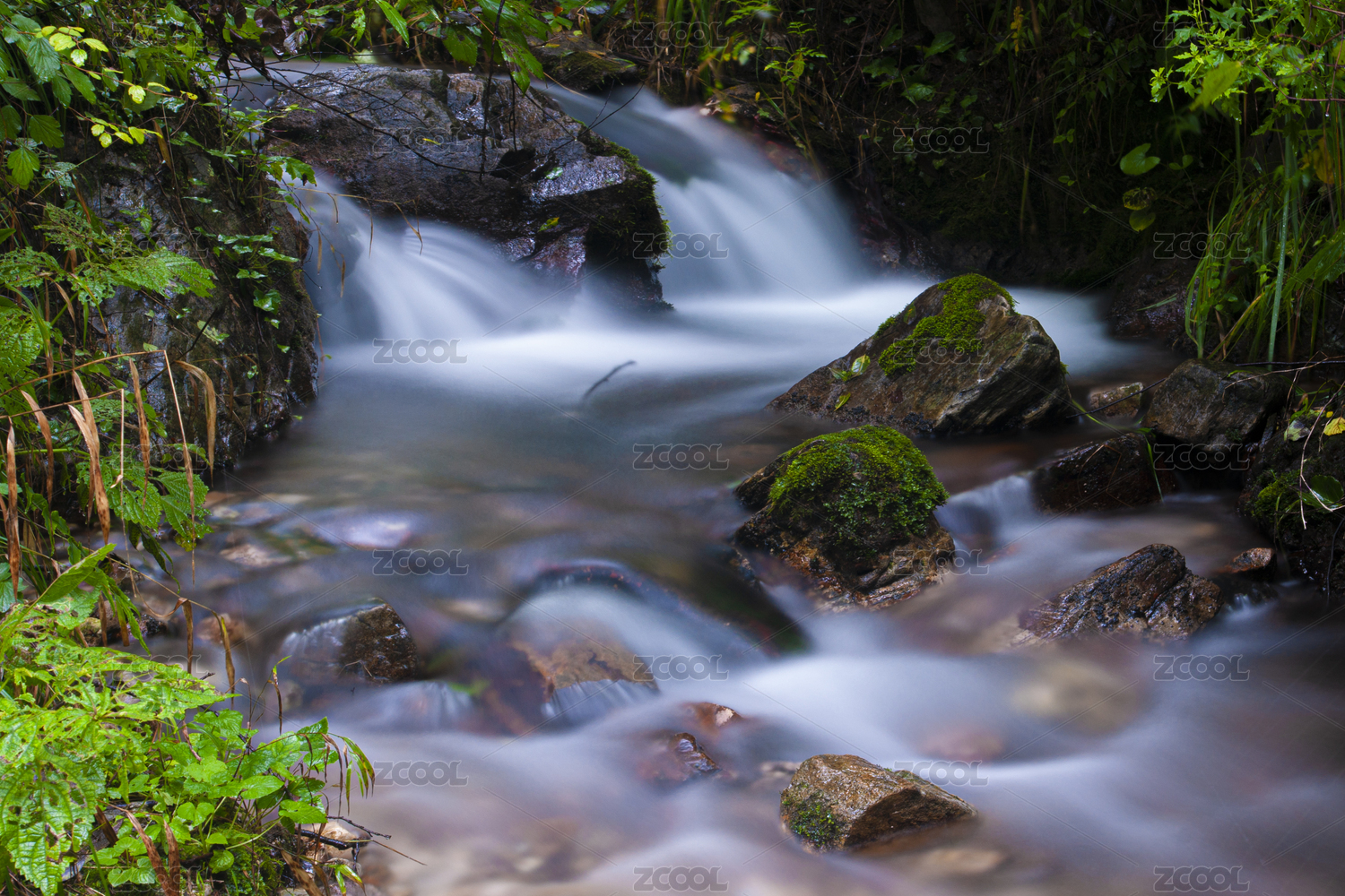 慢门下小溪中丝状的流水与长满青苔和小草的石头