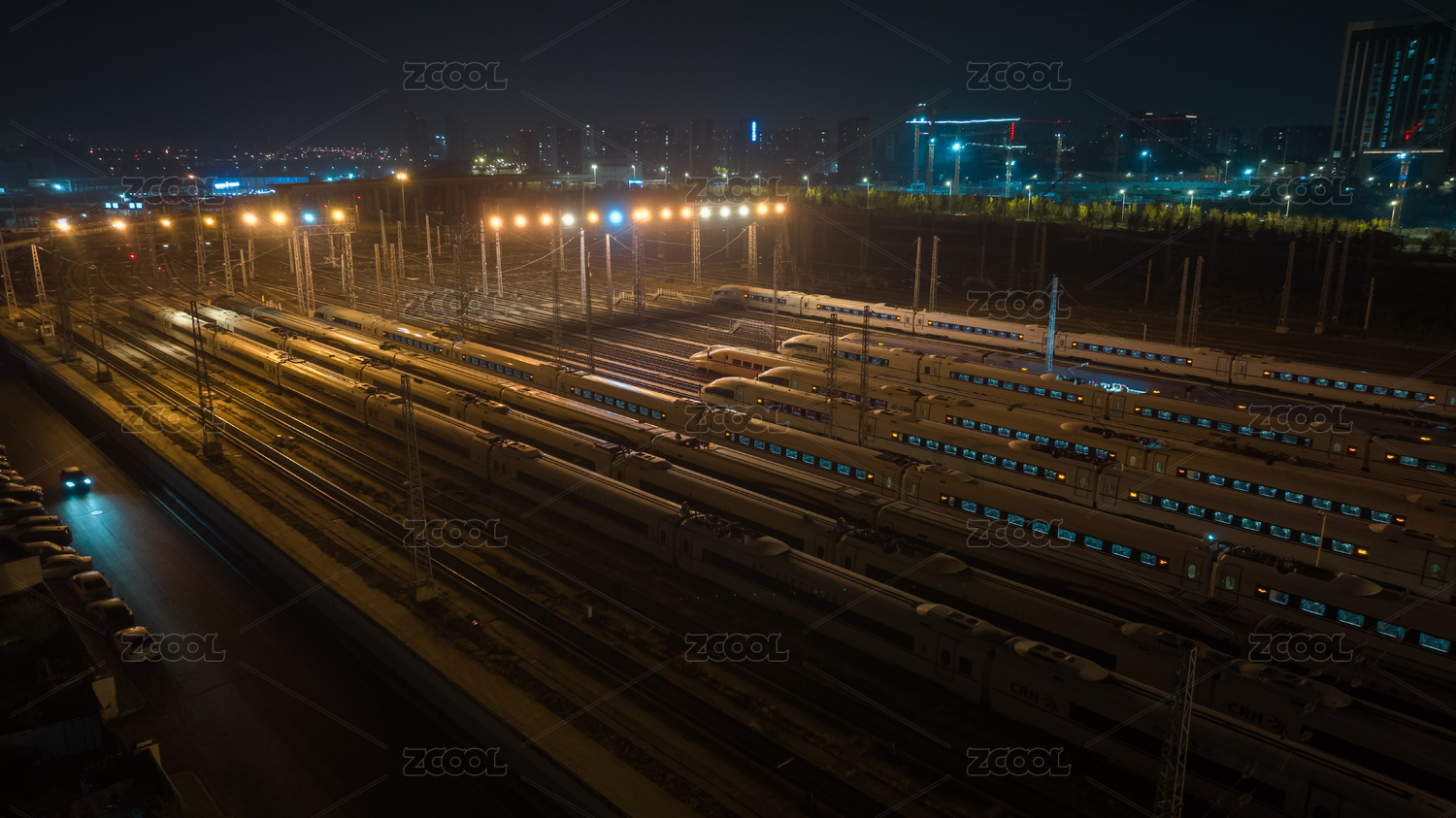 高铁列车郑州动车运用所存车场夜景夜晚俯拍