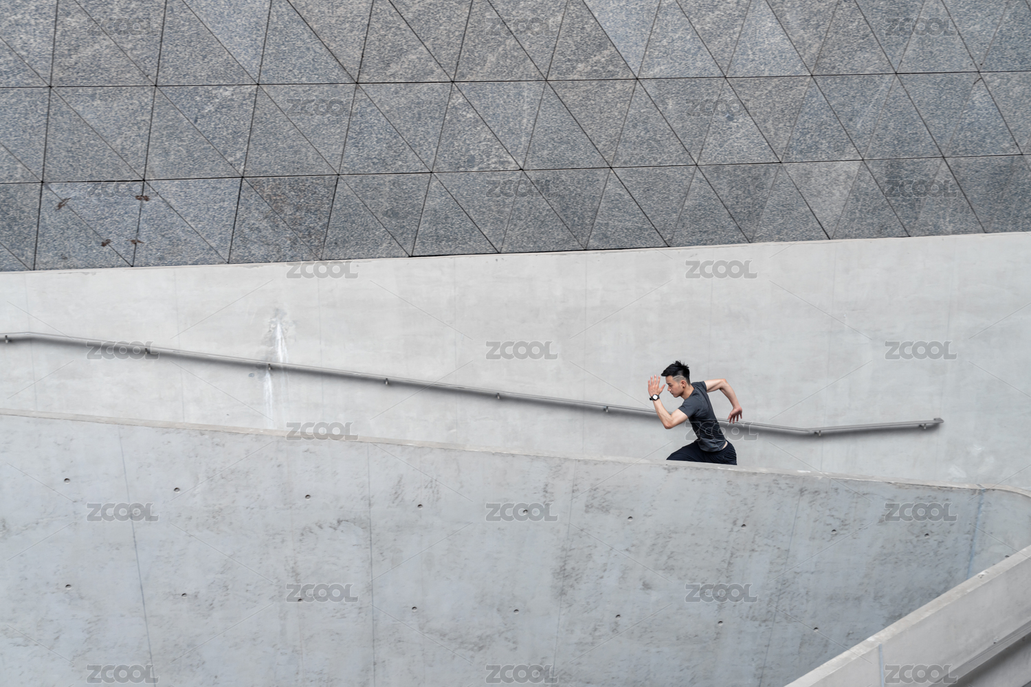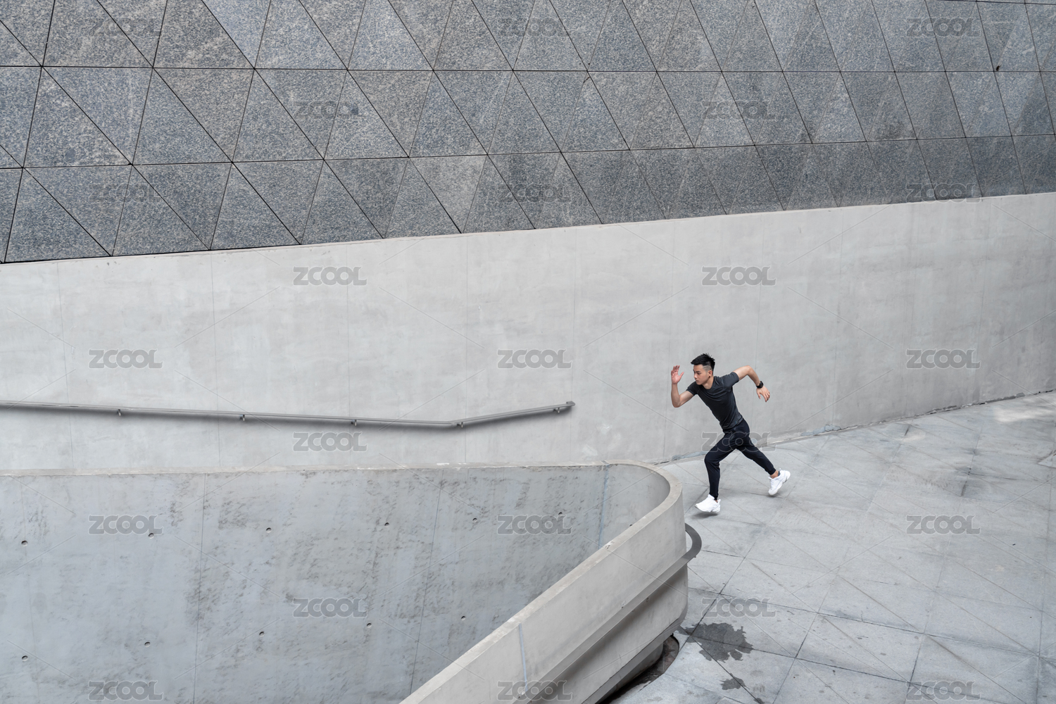 一名年轻的中国男性在城市的建筑旁边跑步