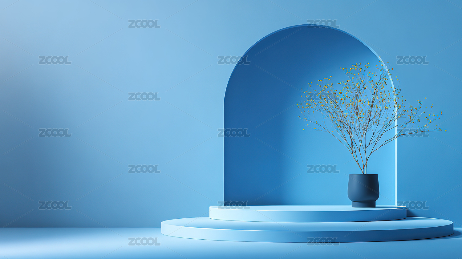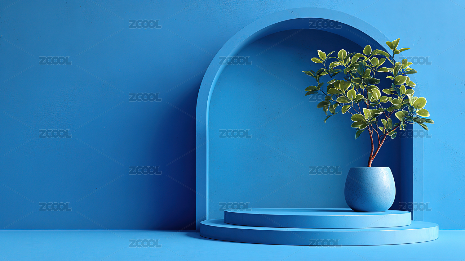 蓝墙前的圆形植物展台