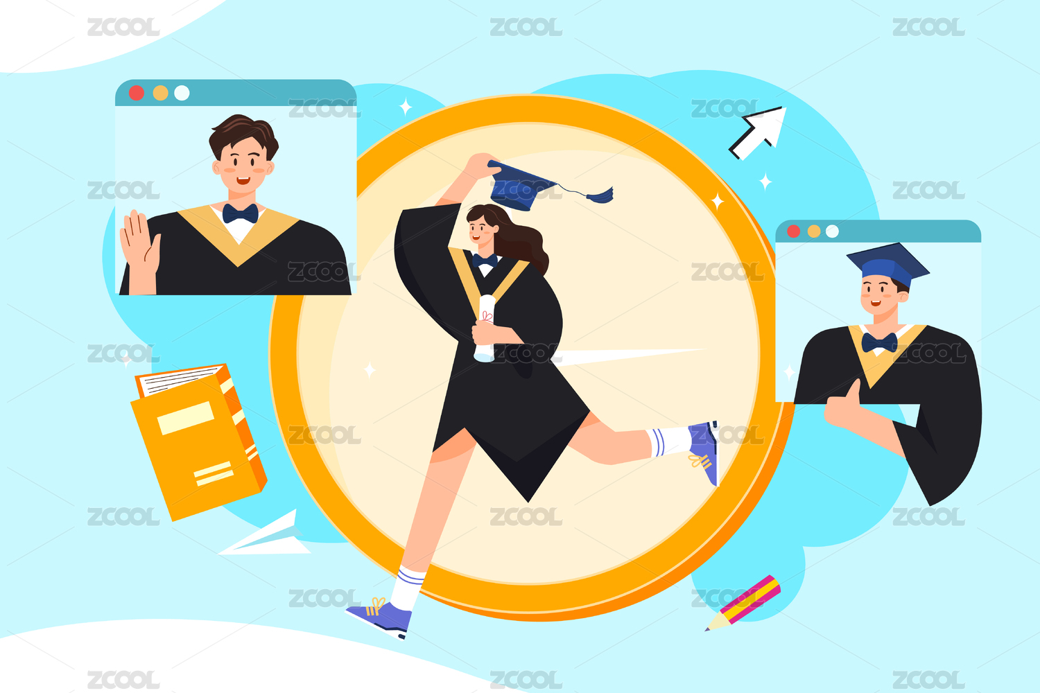 毕业季同学身穿学士服庆祝插画