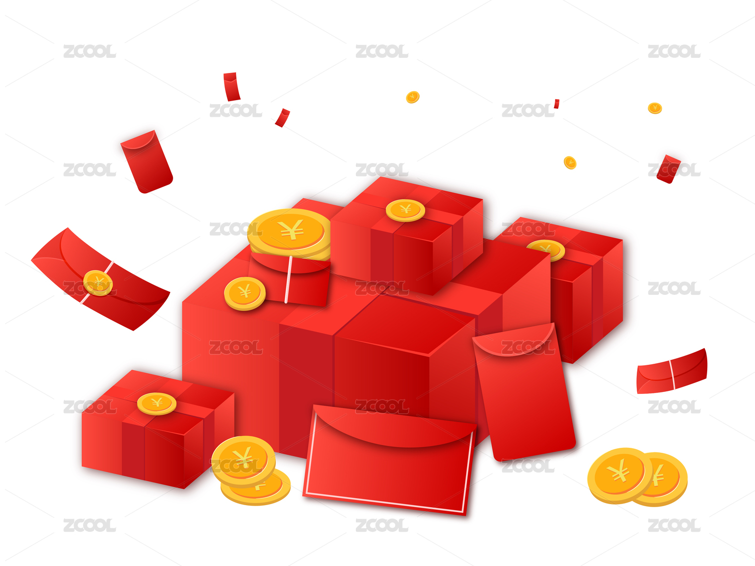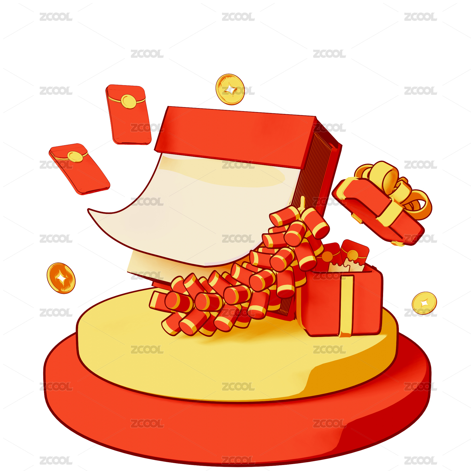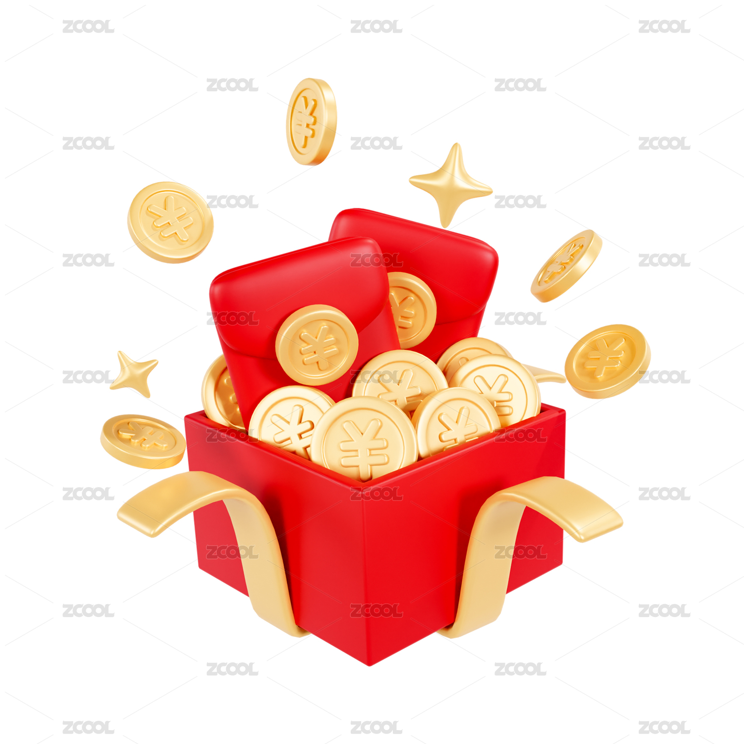 3D渲染的打开的红色礼盒红包金币优惠券礼