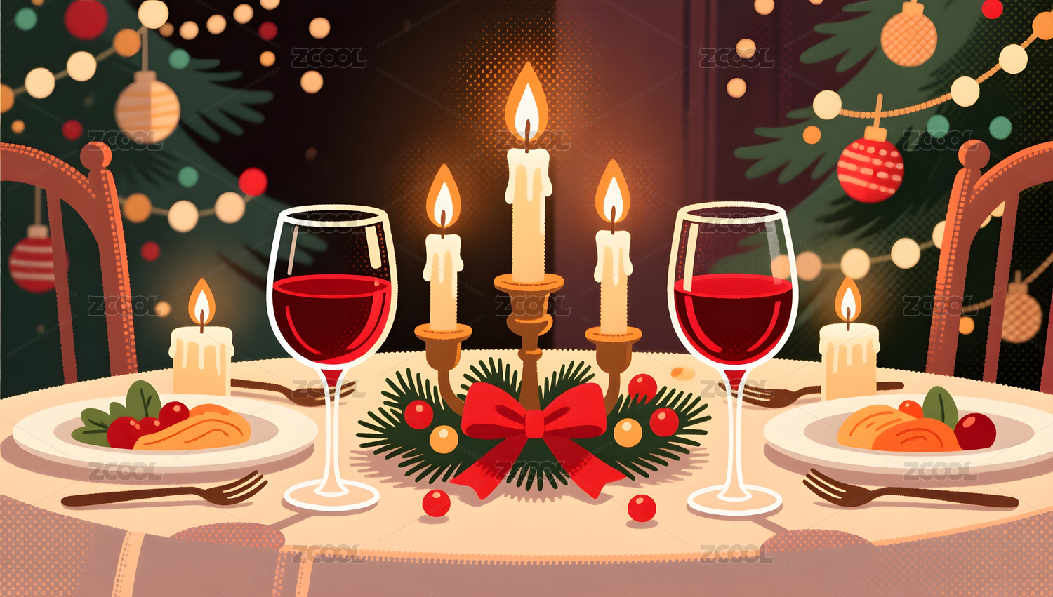 卡通手绘感恩节吃火鸡烛光晚餐创意卡通插画