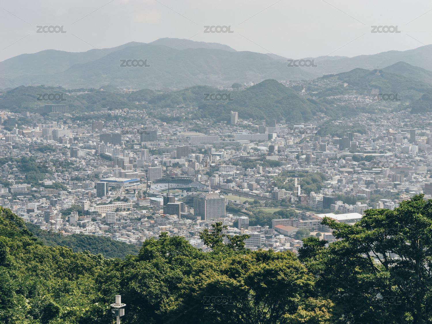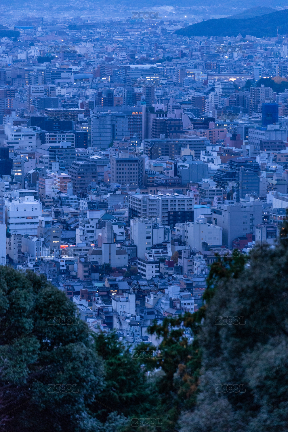 亚洲日本京都冬季上午城市现代建筑群和远山