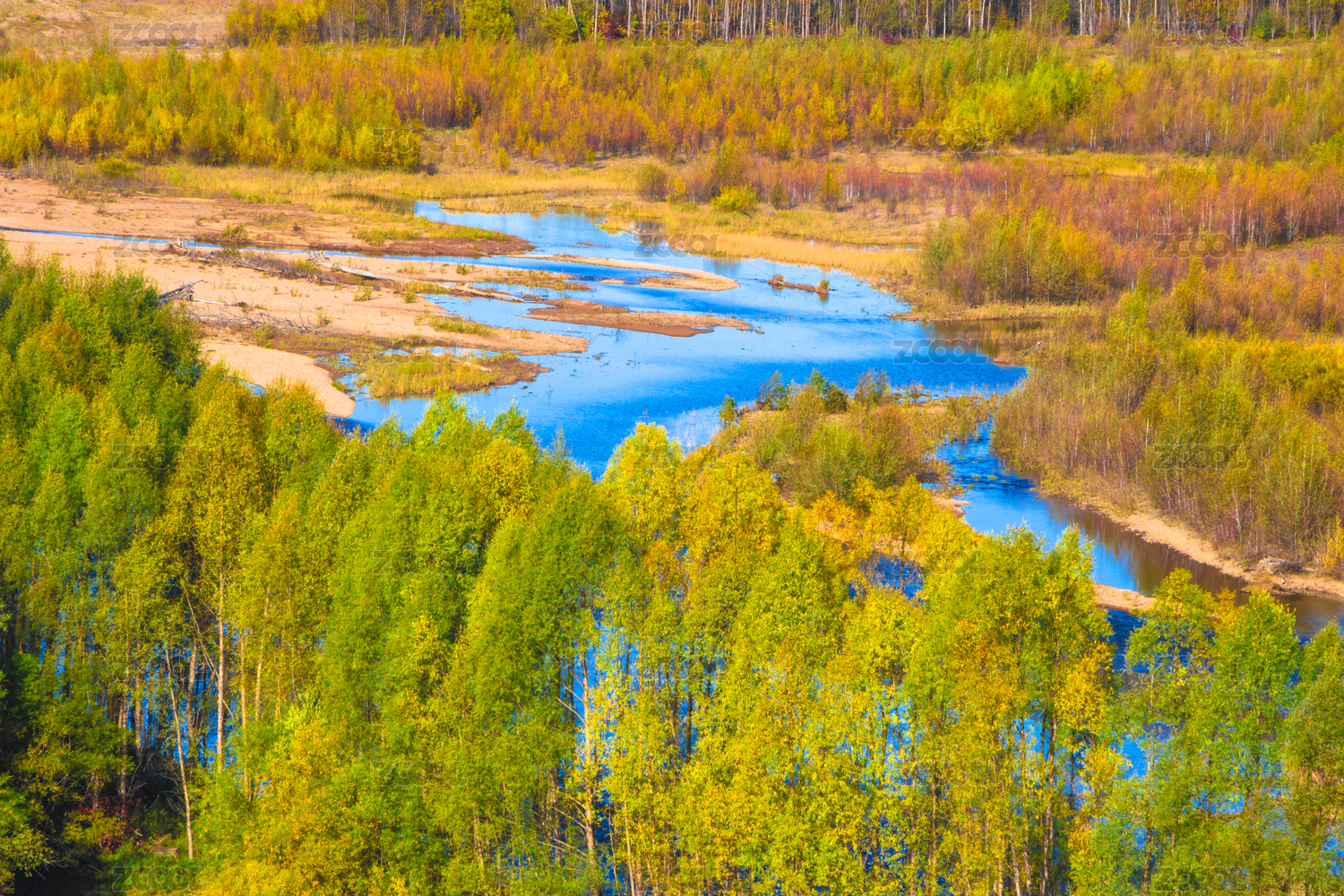 内蒙古阿尔山秋天里的河流和金黄色森林风景