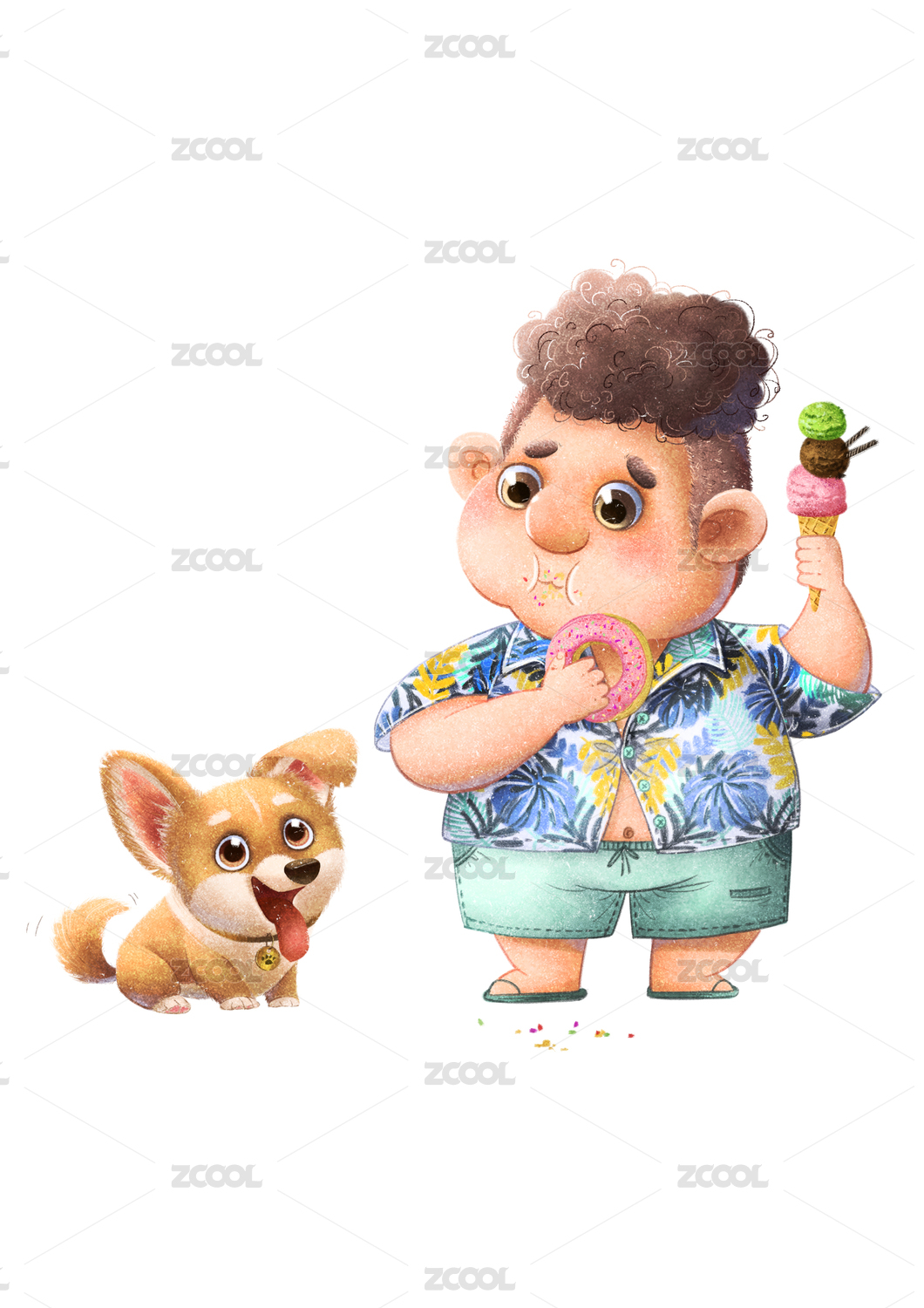 吃甜品的男孩与柯基