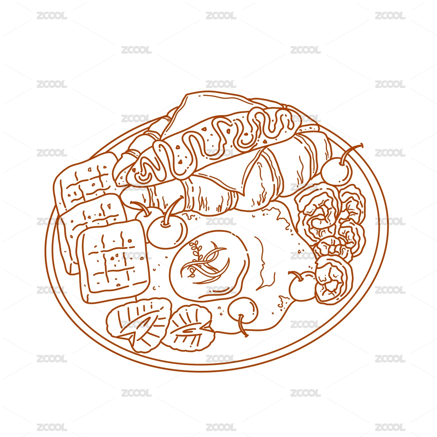 美食食物火锅丸子虾香菇肥牛餐线稿矢量插画