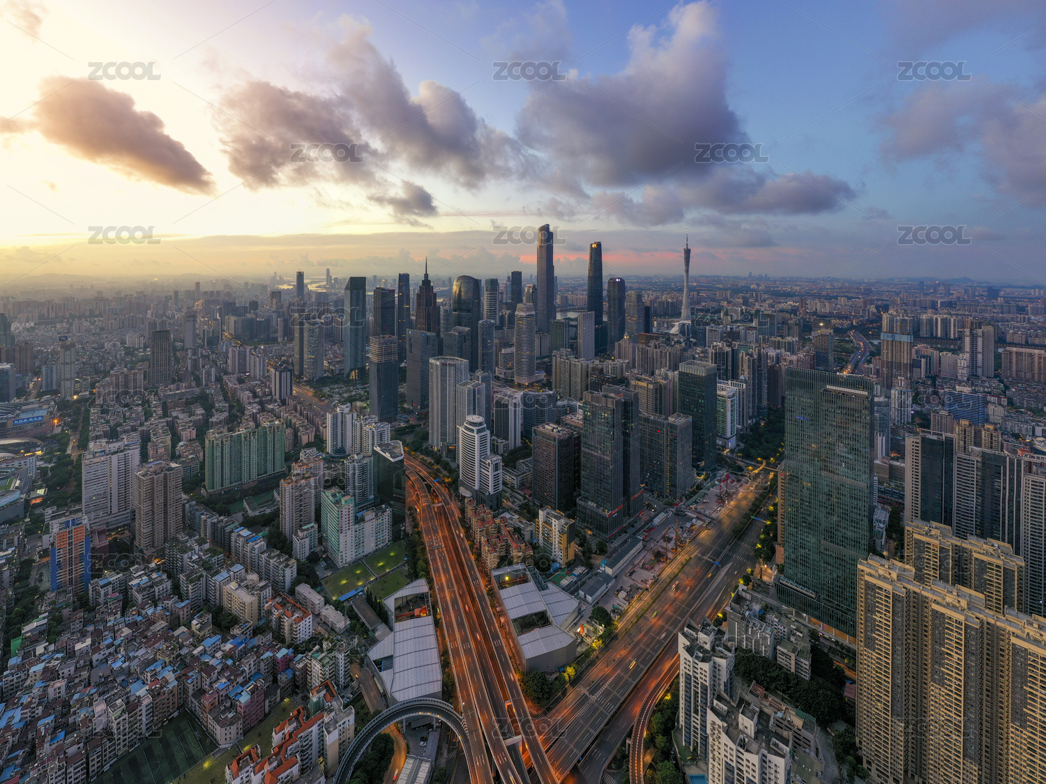 航拍珠江新城日出全景