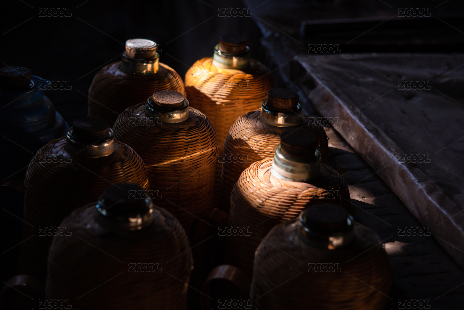 茶馆里老式竹编外壳的暖水瓶和仿古陶瓷花瓶