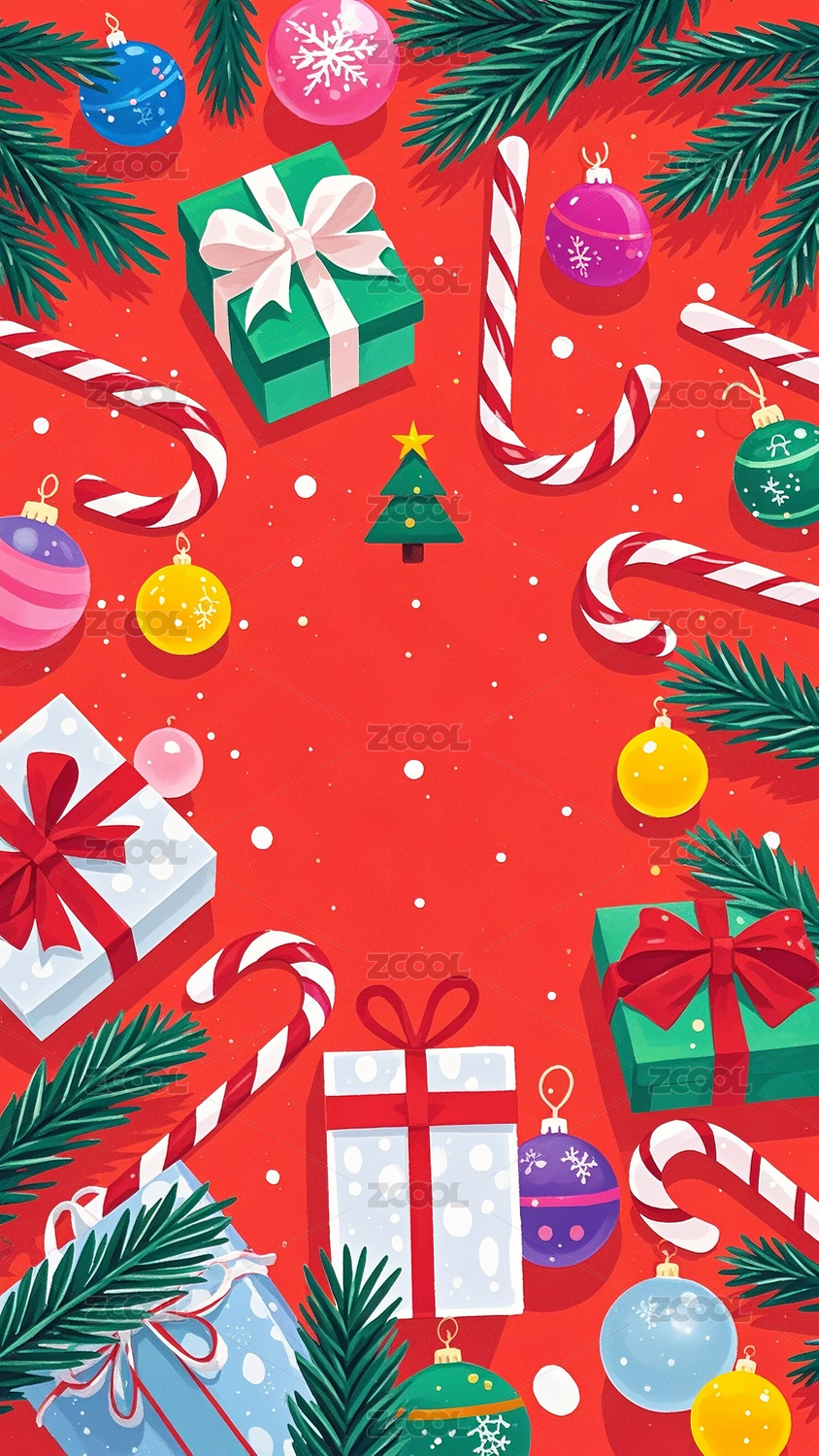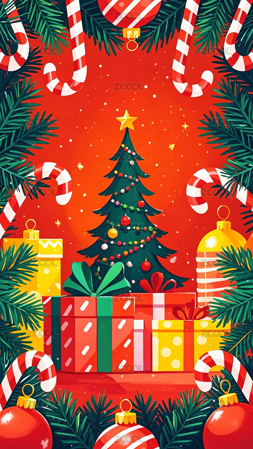圣诞节糖果冬青叶礼物平面插画